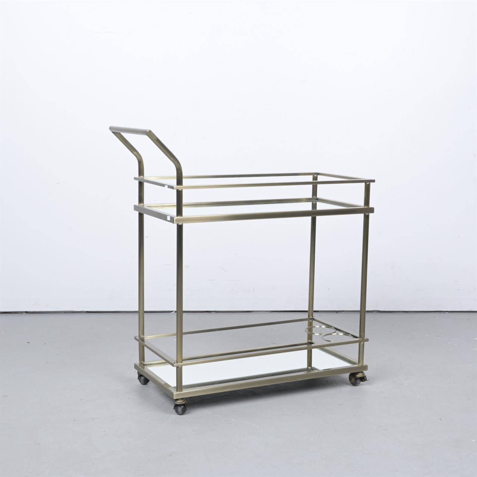A BRONZED METAL DRINKS TROLLEY WITH TWO MIRRORED TIERS (86CM H X 78CM W X 35CMD)