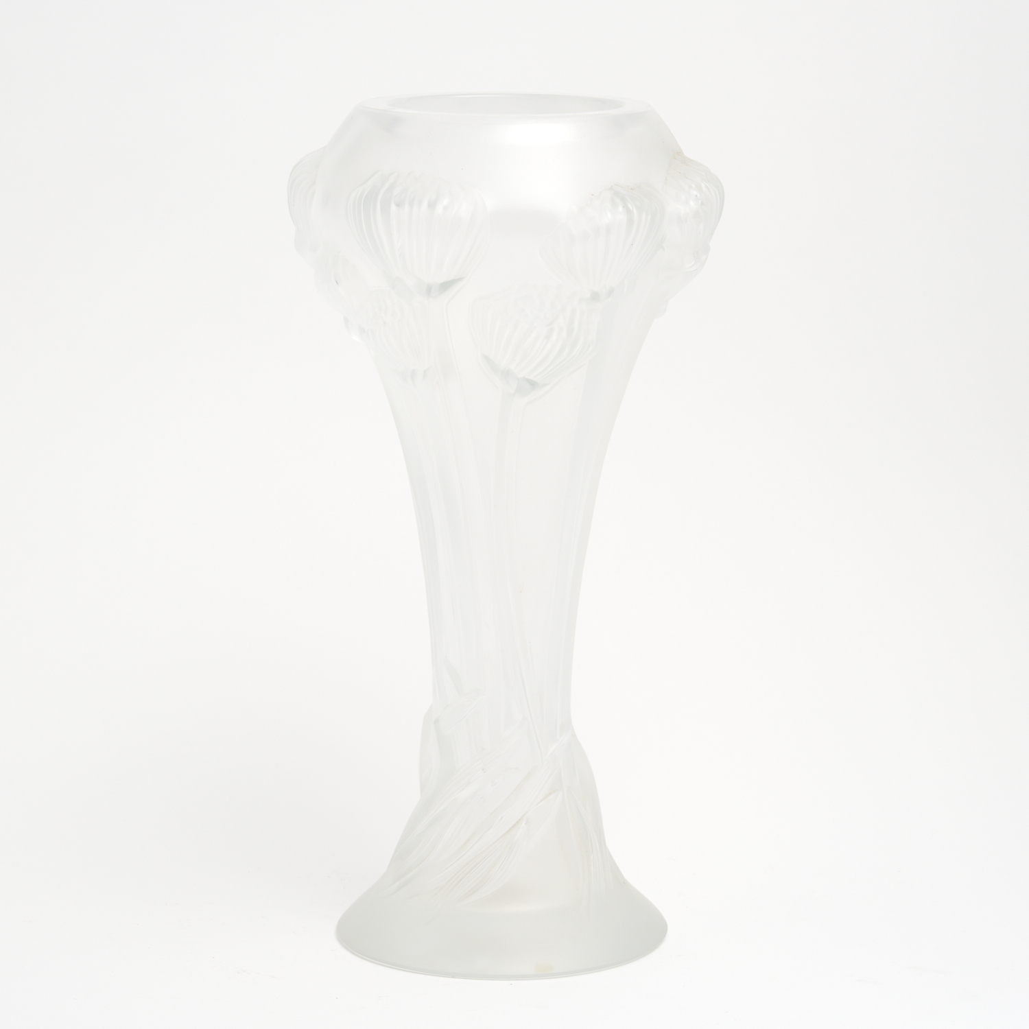 A LALIQUE CRYSTAL BUTTON ROSE VASE, SIGNED TO BASE 'LALIQUE FRANCE' H.37CM