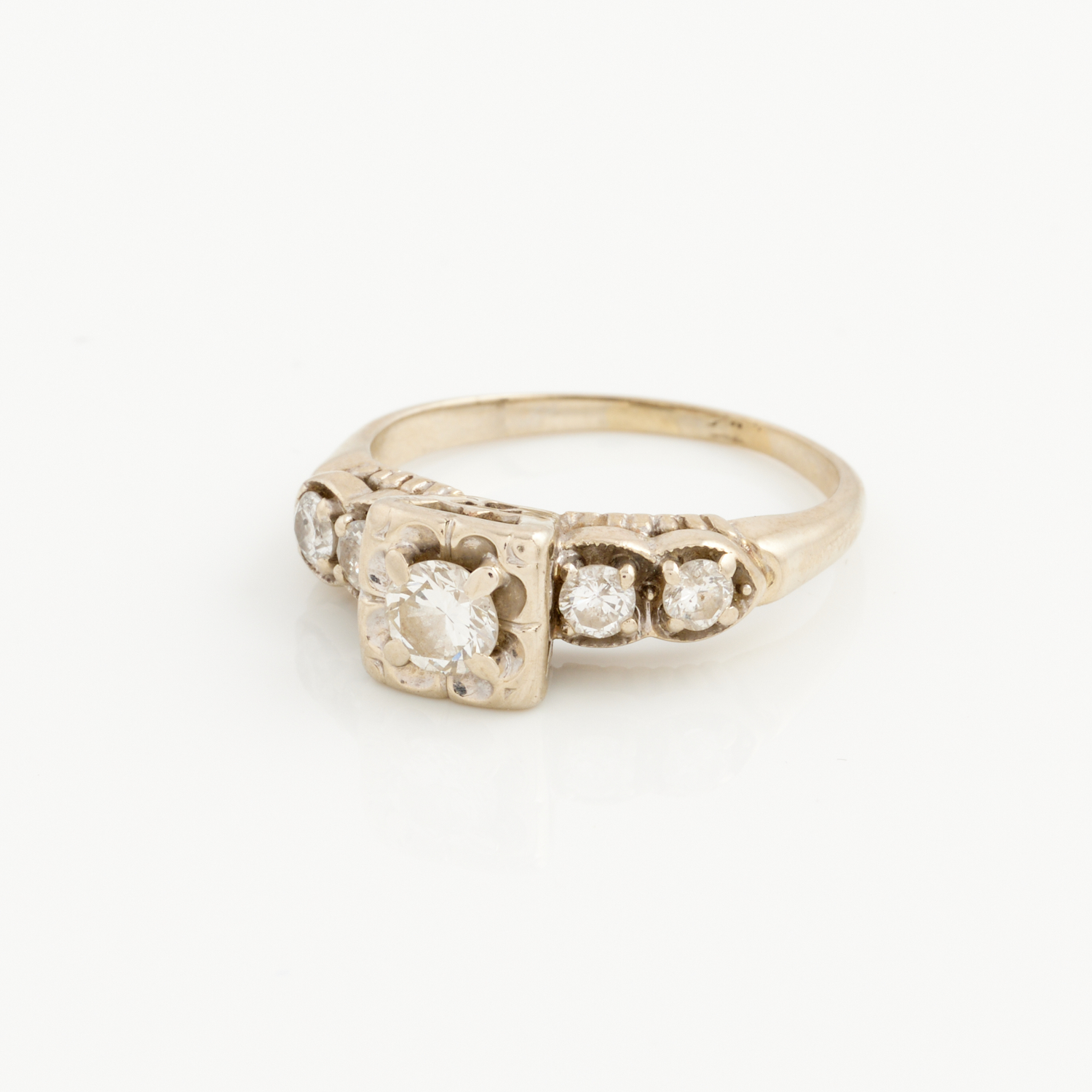 A DIAMOND RING IN 14CT WHITE GOLD, THE CENTRAL DIAMOND WEIGHING APPROXIMATELY 0.20CTS, SIZE M, 3.1GMS