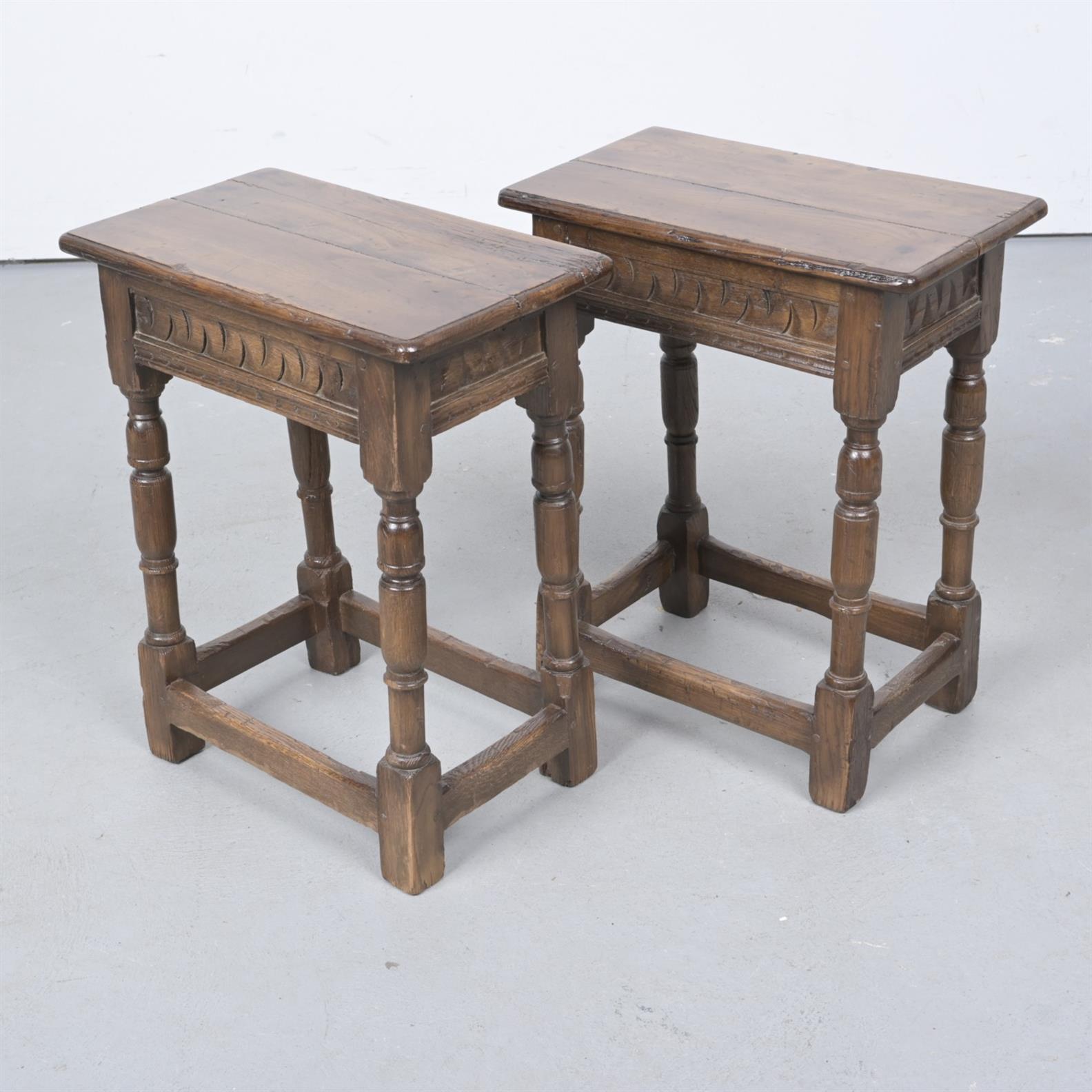 A PAIR OF CHARLES II-STYLE OAK JOINT STOOLS (56H X 47W X 28D CM)