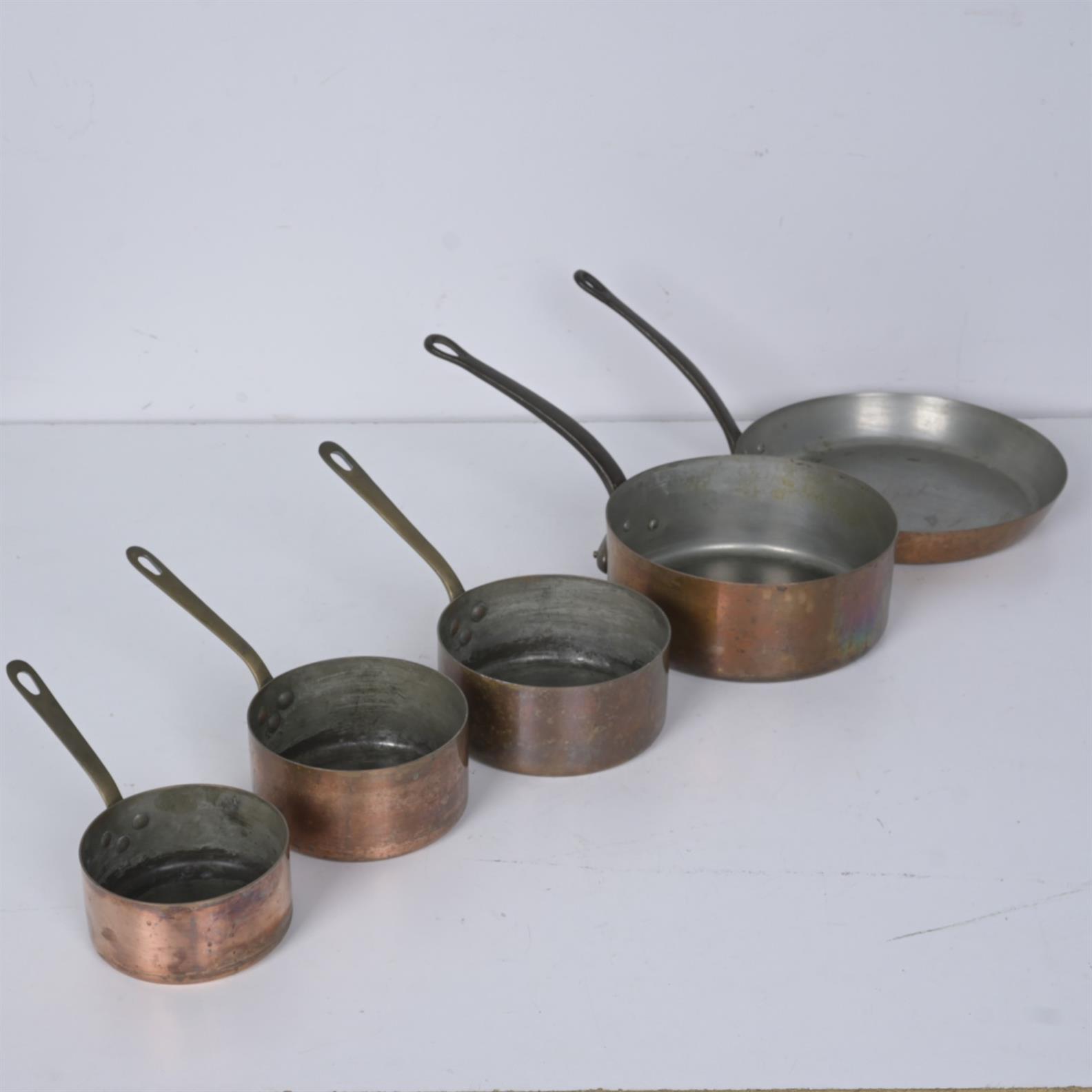 A COLLECTION OF FIVE FRENCH COPPER POTS (28CM DIA LARGEST)