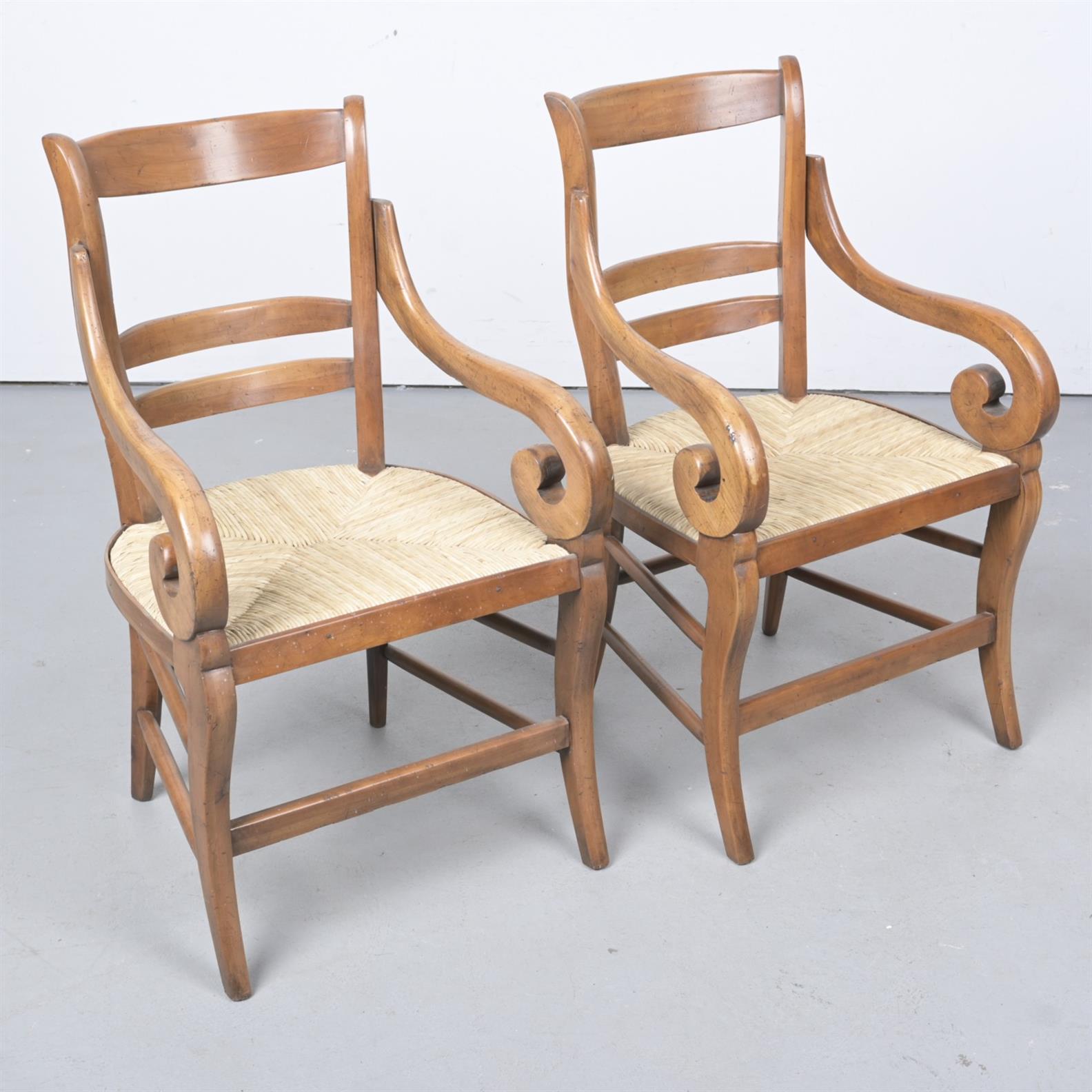 A PAIR OF PROVINCIAL LOUIS PHILIPPE-STYLE BEECH OPEN ARM CHAIRS WITH RUSH SEATS (91CM H X 56CM W X 62CM D)
