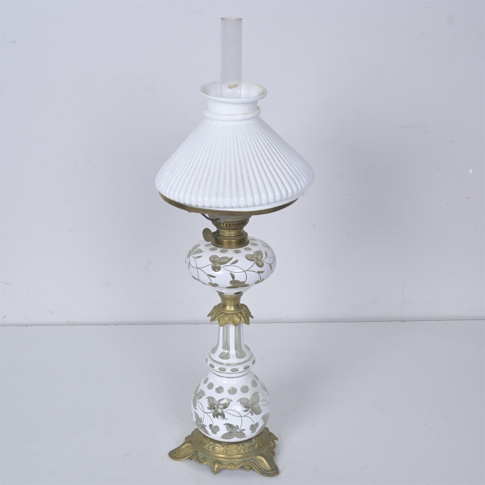 A GLASS BASED OIL LAMP WITH BRASS DETAIL (64CM H)