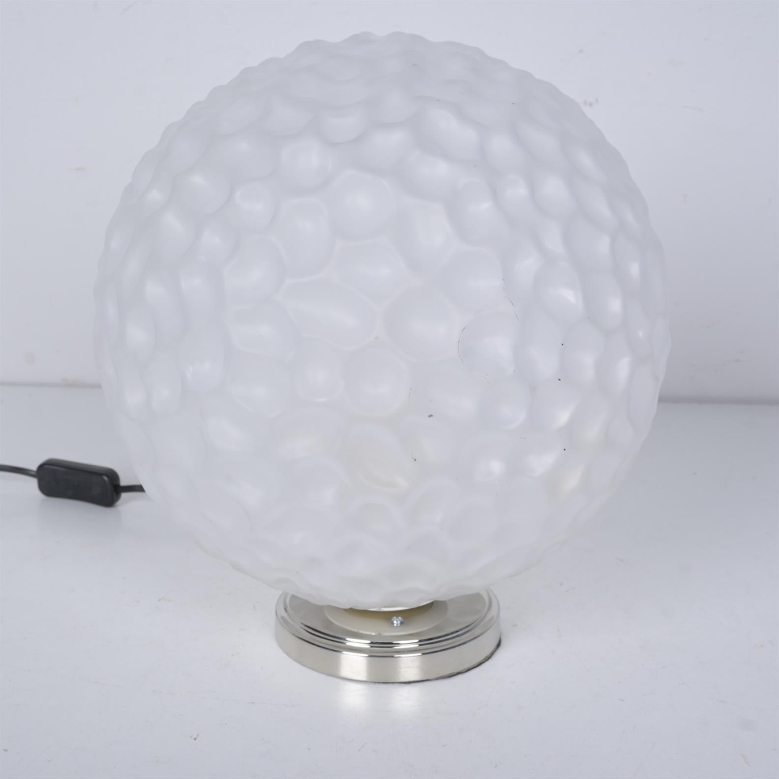 A SPHERICAL GLASS TABLE LAMP ON CHROMED BASE