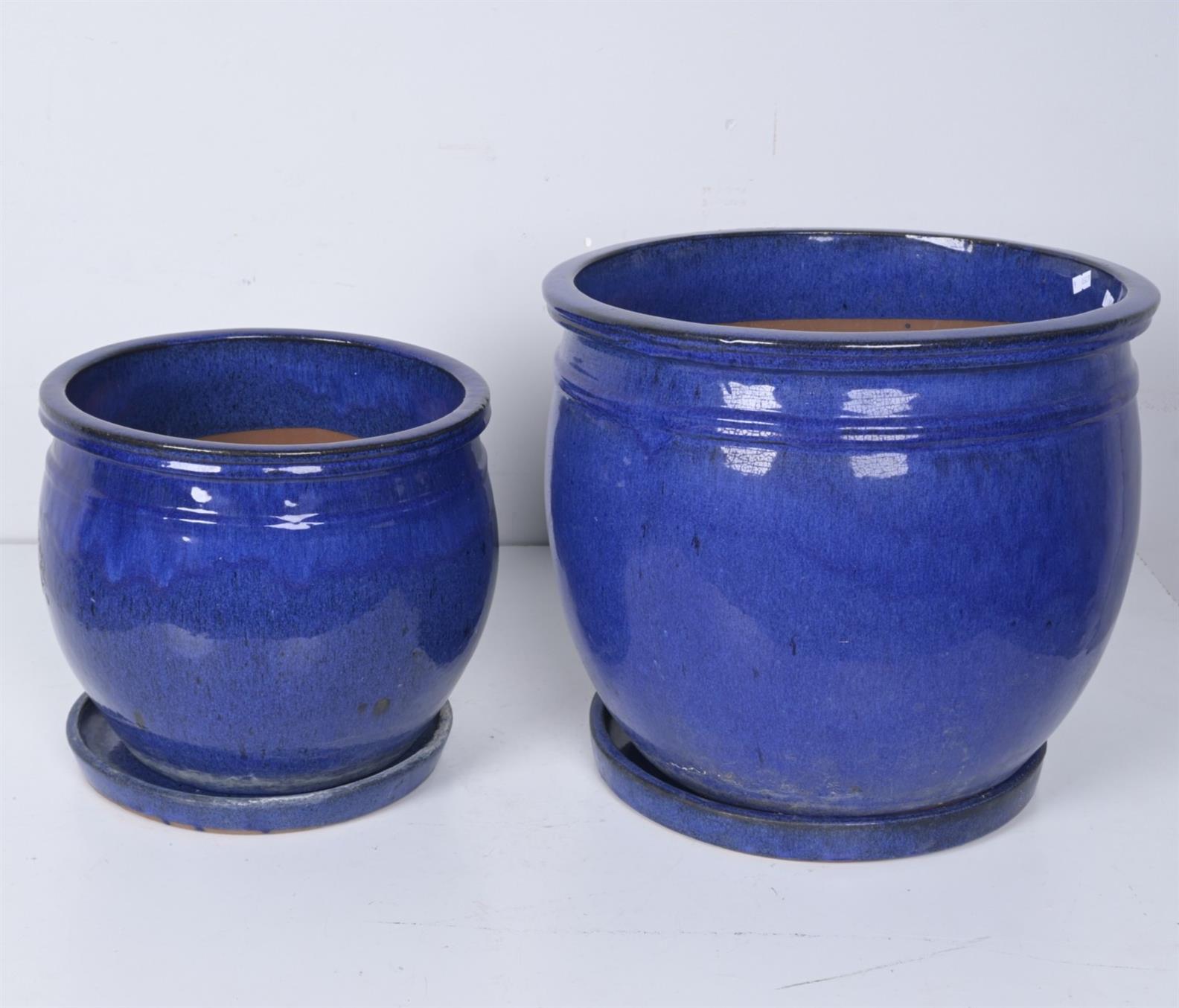 TWO BLUE GLAZED POTS WITH UNDERPLATES (38H X 44CM DIA LARGEST)