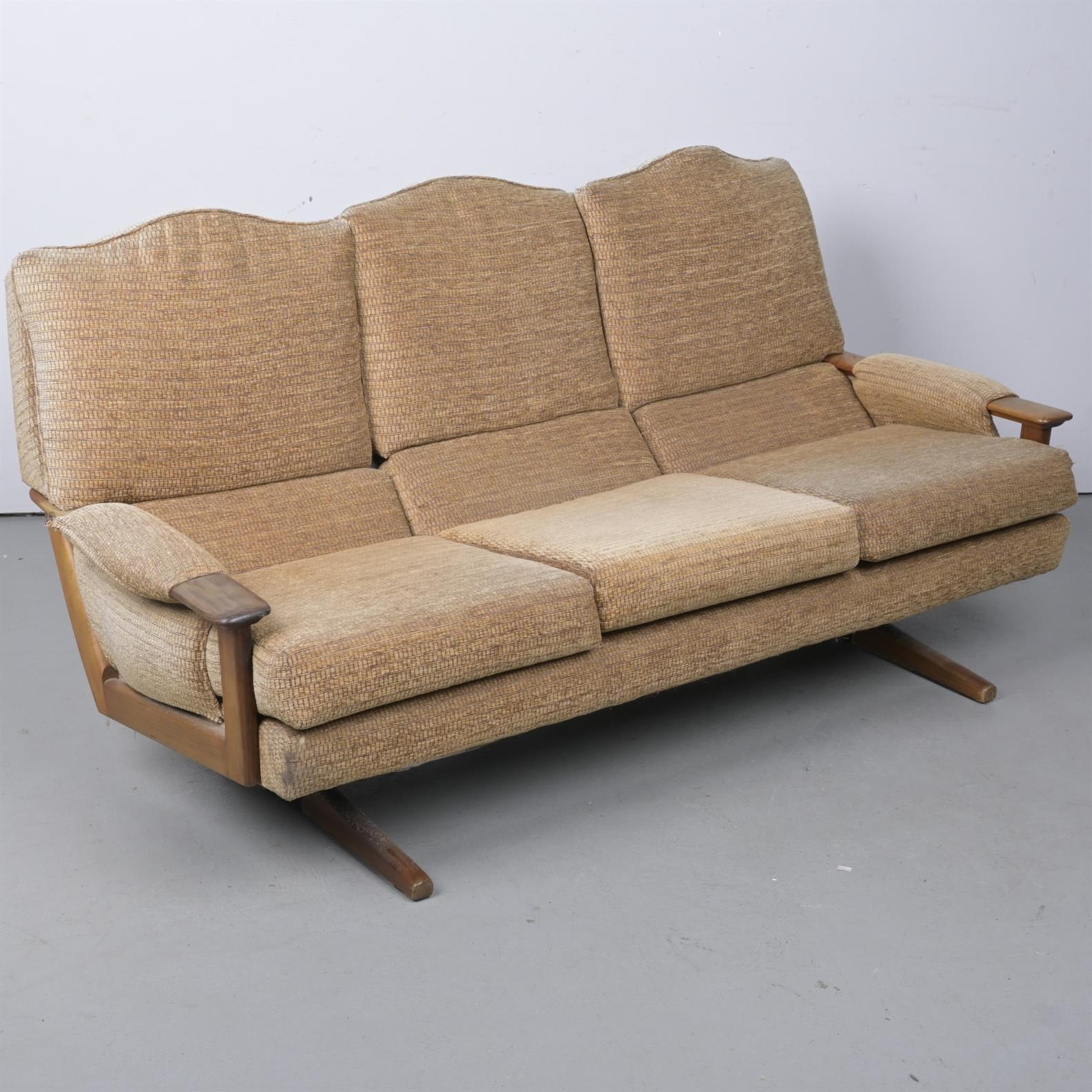 A 1970s TEAK-FRAMED THREE-SEAT SOFA, APPARENTLY A TESSA 'T21' (A/F) (80CM H X 76CM W X 84CM D) (THIS ITEM MUST BE REMOVED BY CARRIERS AT THE CUSTOMER'S EXPENSE. LEONARD JOEL STAFF CANNOT ASSIST CARRYING THIS ITEM)