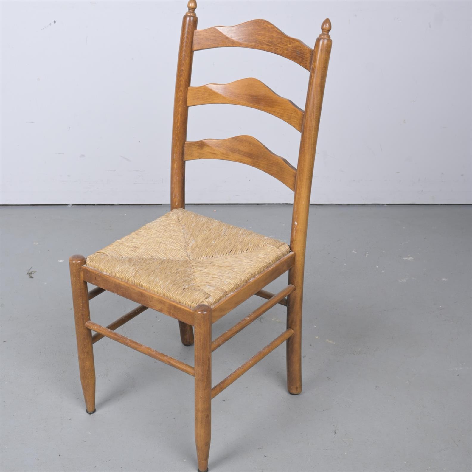 A PROVINCIAL GEORGE III-STYLE BEECH LADDERBACK SIDE CHAIR, WITH RUSH SEAT (101H X 42W X 54D CM)
