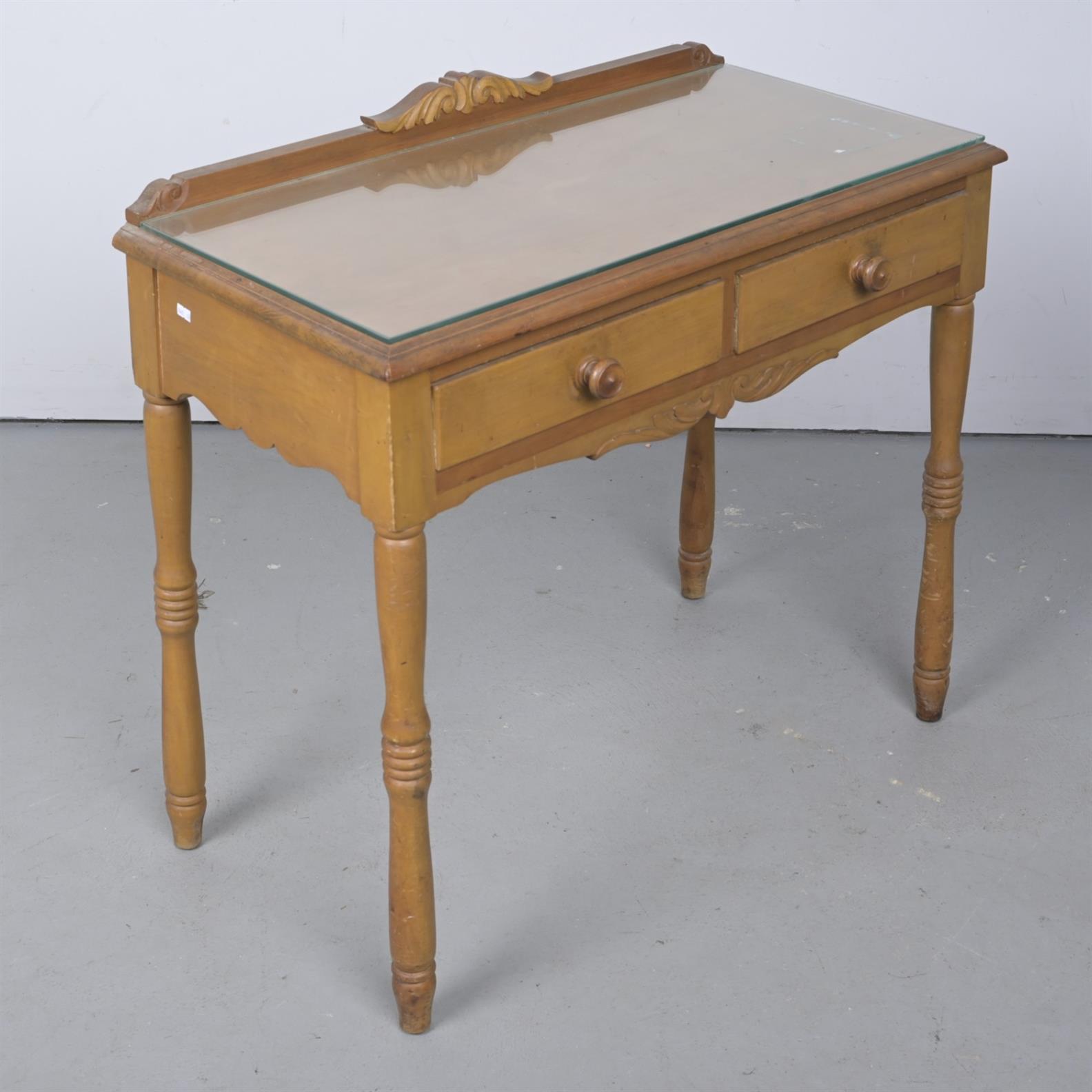 A MYRTLE SIDE TABLE IN ANTIQUE MANNER, WITH LOOSE GLASS COVER (83CM H X 88CM W X 44CM D)