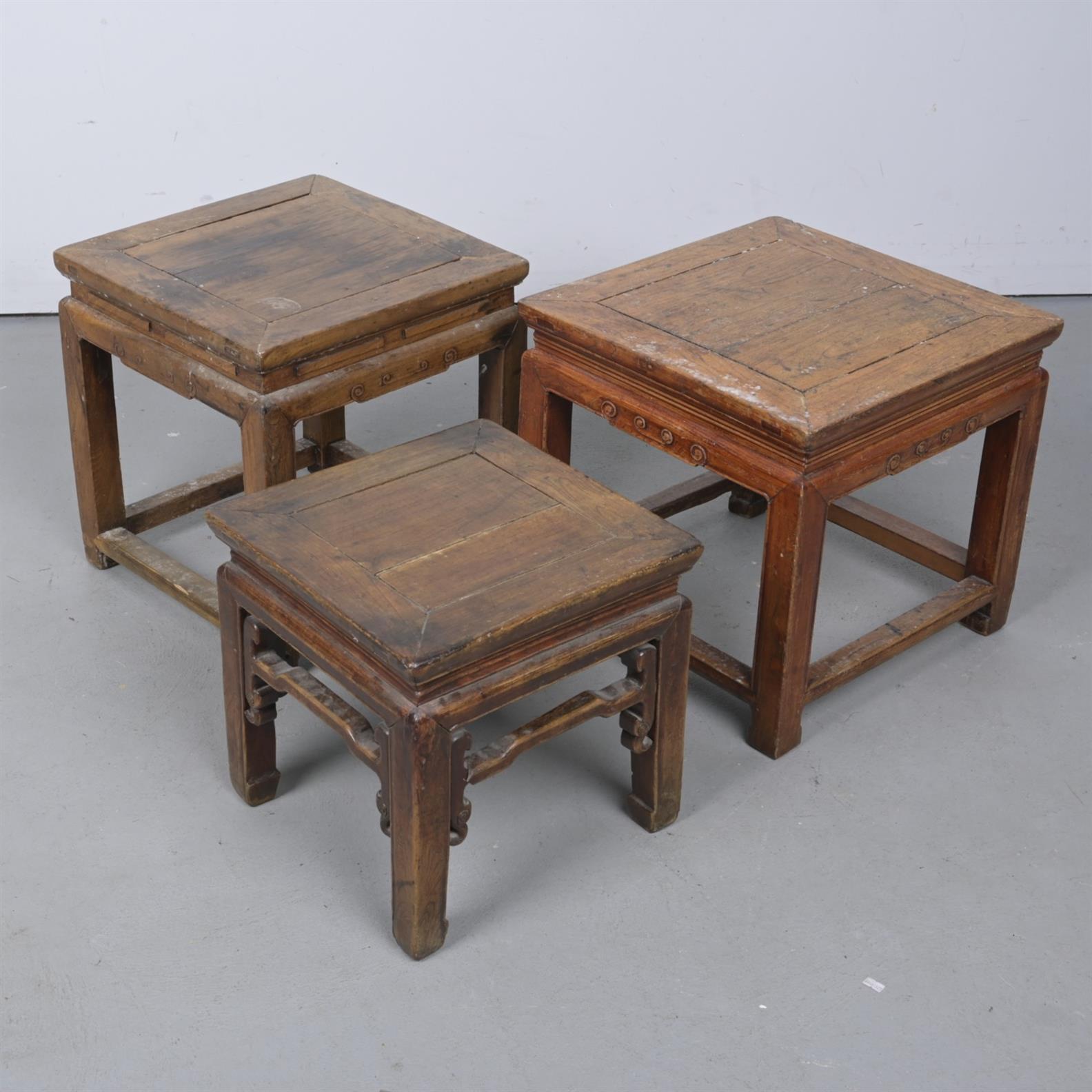 TWO SIMILAR ANTIQUE CHINESE ELM LOW STANDS, AND A THIRD SMALLER (46CM H X 43CM W LARGEST)