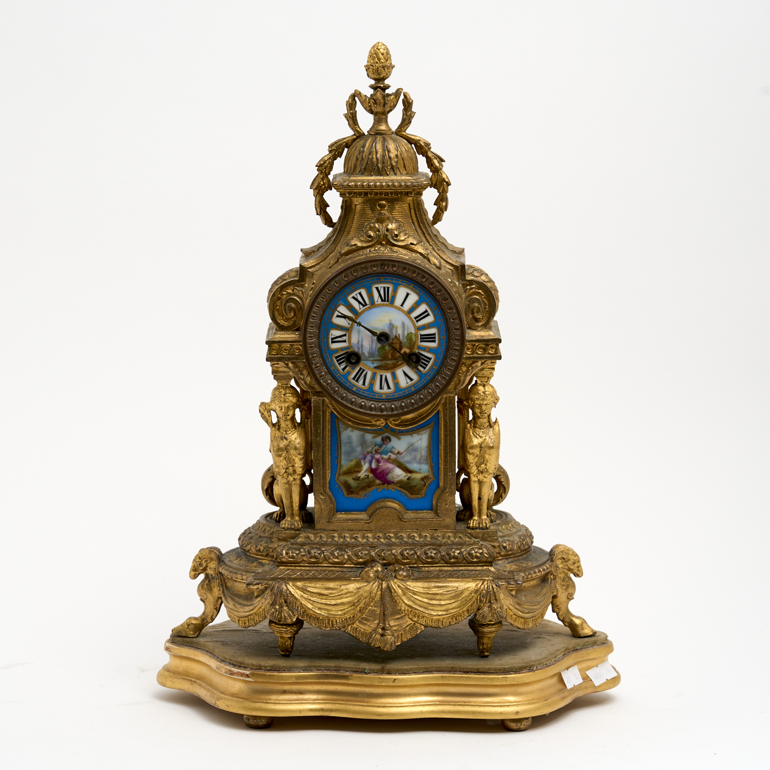 A LATE 19TH CENTURY FRENCH GILT METAL PORCELAIN INSET MANTEL CLOCK ON A SHAPED BASE (NO PENDULUM AND NO KEY) H.44CM (TOTAL HEIGHT)