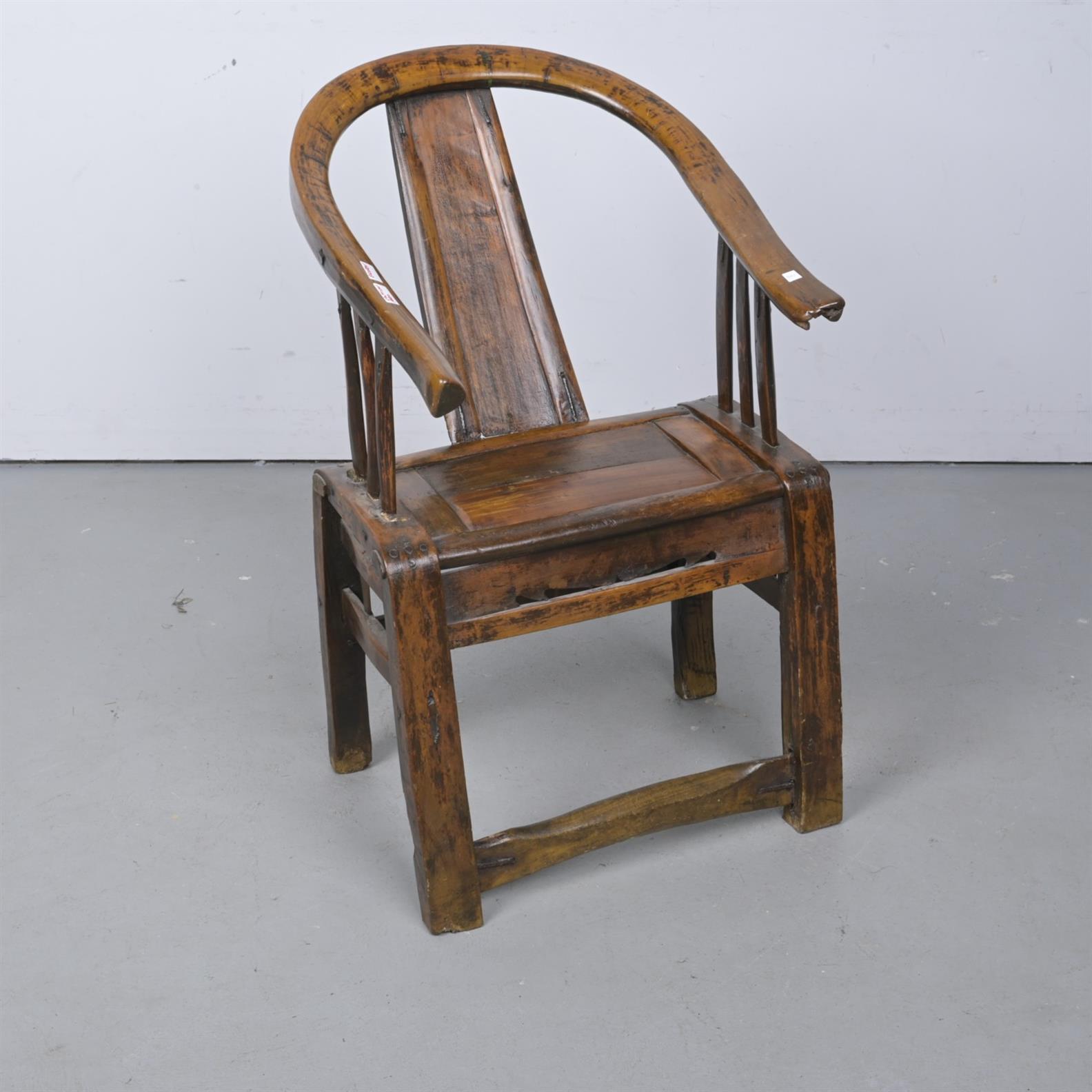 AN ANTIQUE PROVINCIAL CHINESE HARDWOOD ARMCHAIR (A/F) (93CM H X 59CM W)