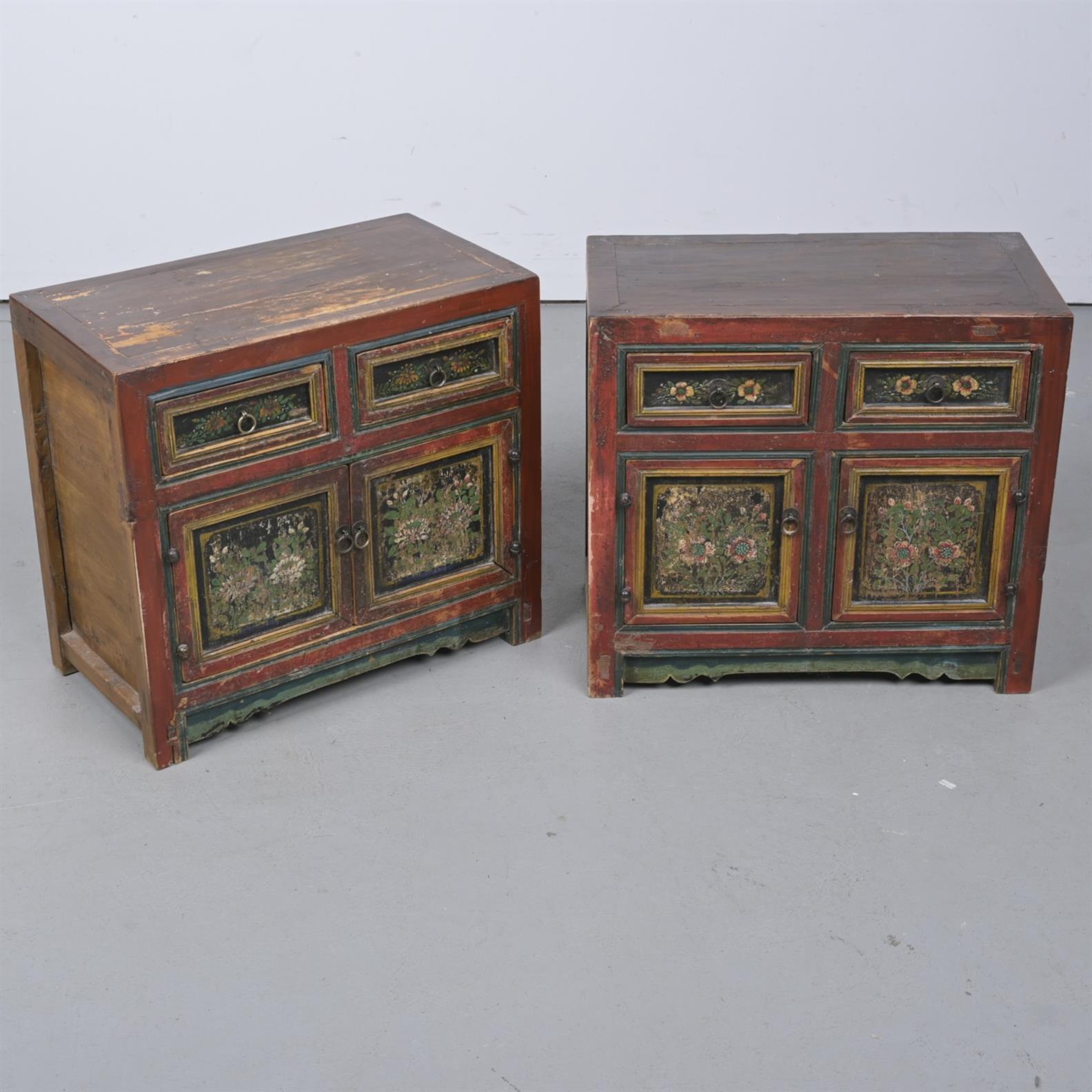 A PAIR OF SMALL ANTIQUE-STYLE CHINESE CABINETS WITH HAND-PAINTED DECORATION (A/F) (56CM H X 61CM W X 33CM D)