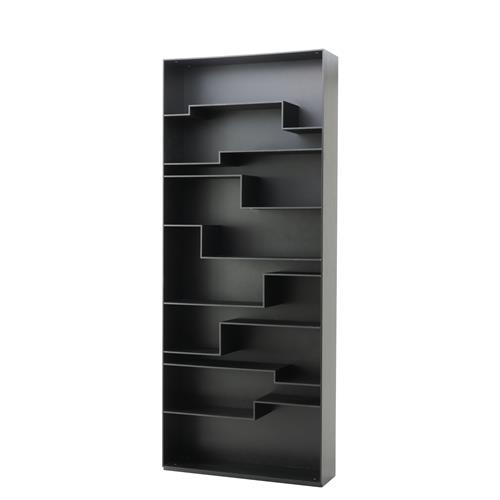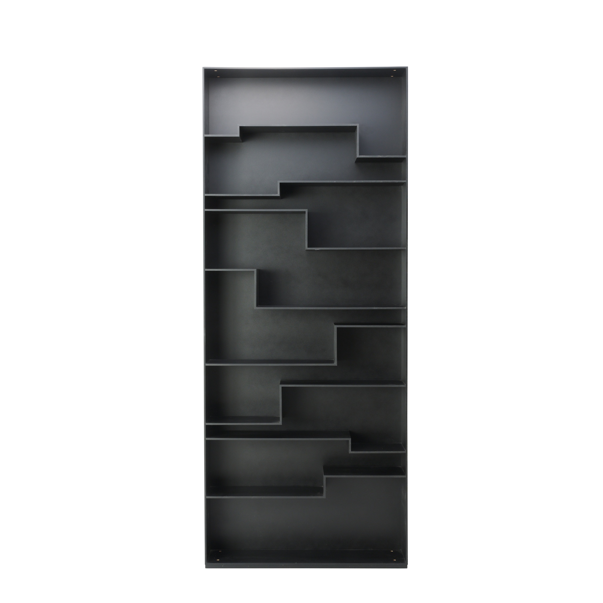 Asymmetrical shelves in matt black lacquered MDF.