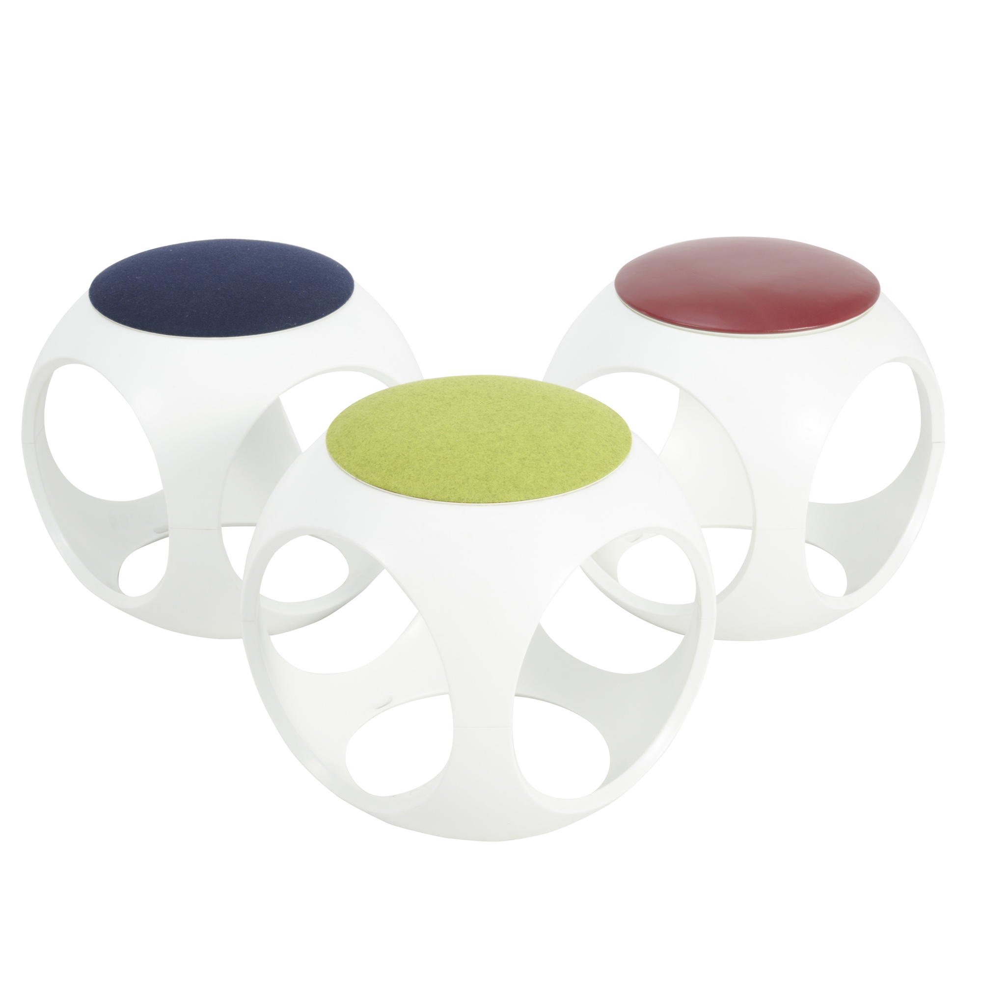 White plastic frames with green red and blue seats. Stackable design with flippable seats allow for use as storage modules or side tables.