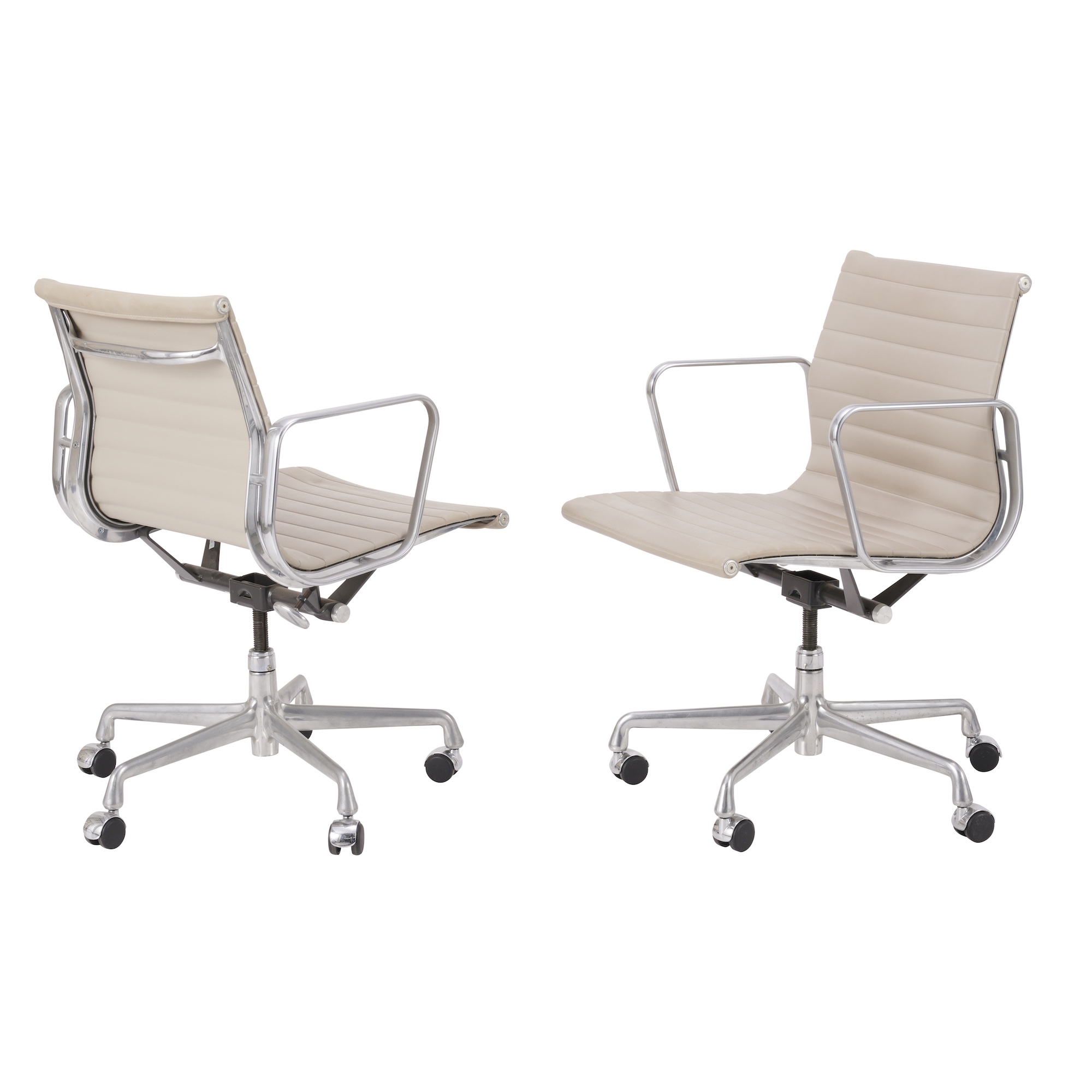 Castor wheels run relatively smoothly for both pieces. The vinyl on one chair shows the beginnings of two slight folds, one towards the top of the backrest and the other towards the edge of the seat. The aluminium arms have a few scratches, as do the bases. Adjustable tilt functions as intended.