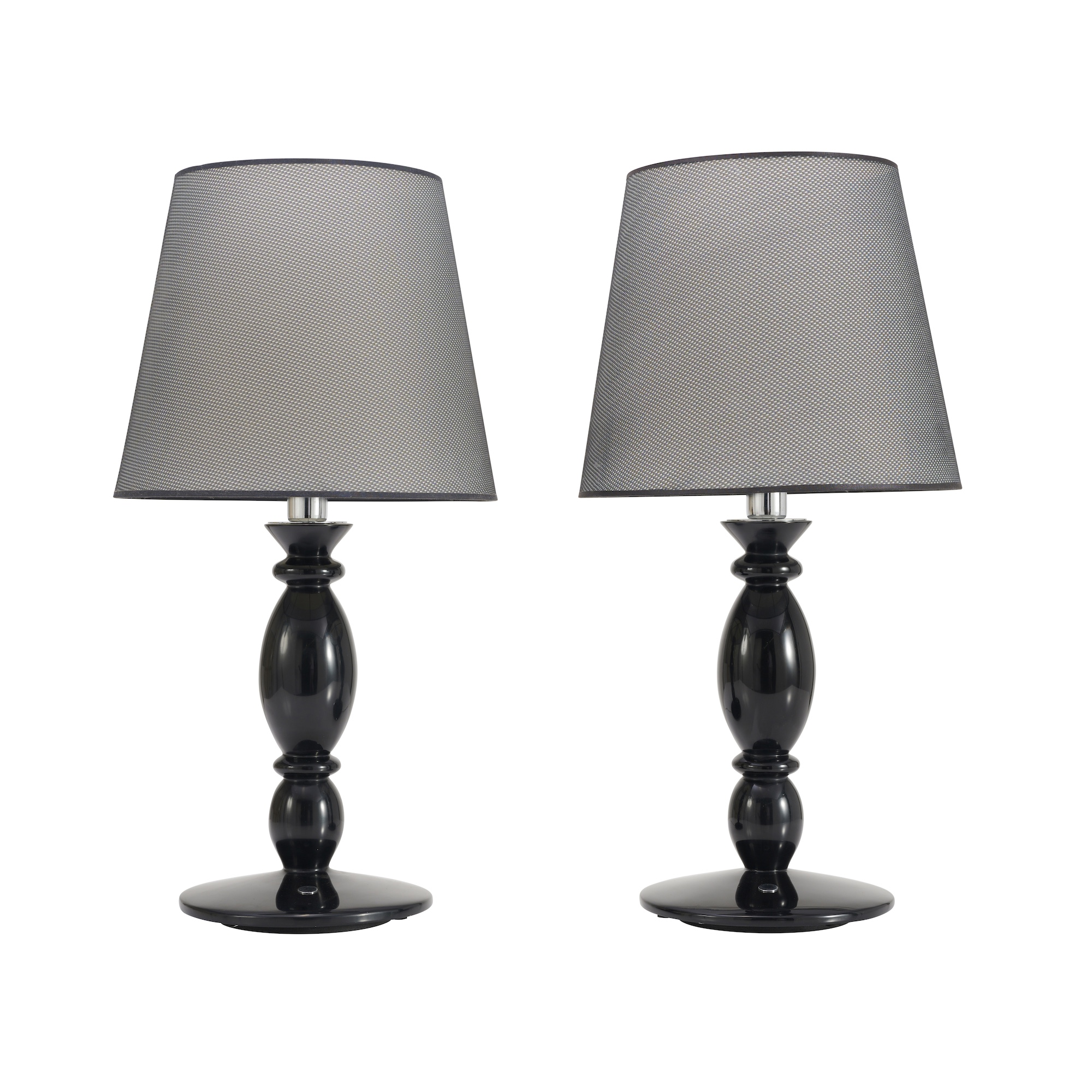 Two table lamps featuring light-diffusing double transparent fabric shades. Constructed from black drilled cloth with a white polyester parchment interior layer. Set atop a black lacquered fibreglass base.