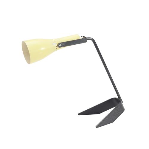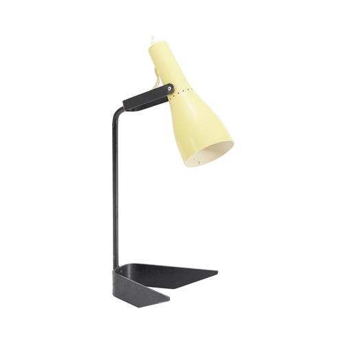 Pale yellow enamelled and perforated aluminium shade on steel stem and base. Adjustable shade and sculptural base allowing upright or tilted forward position.