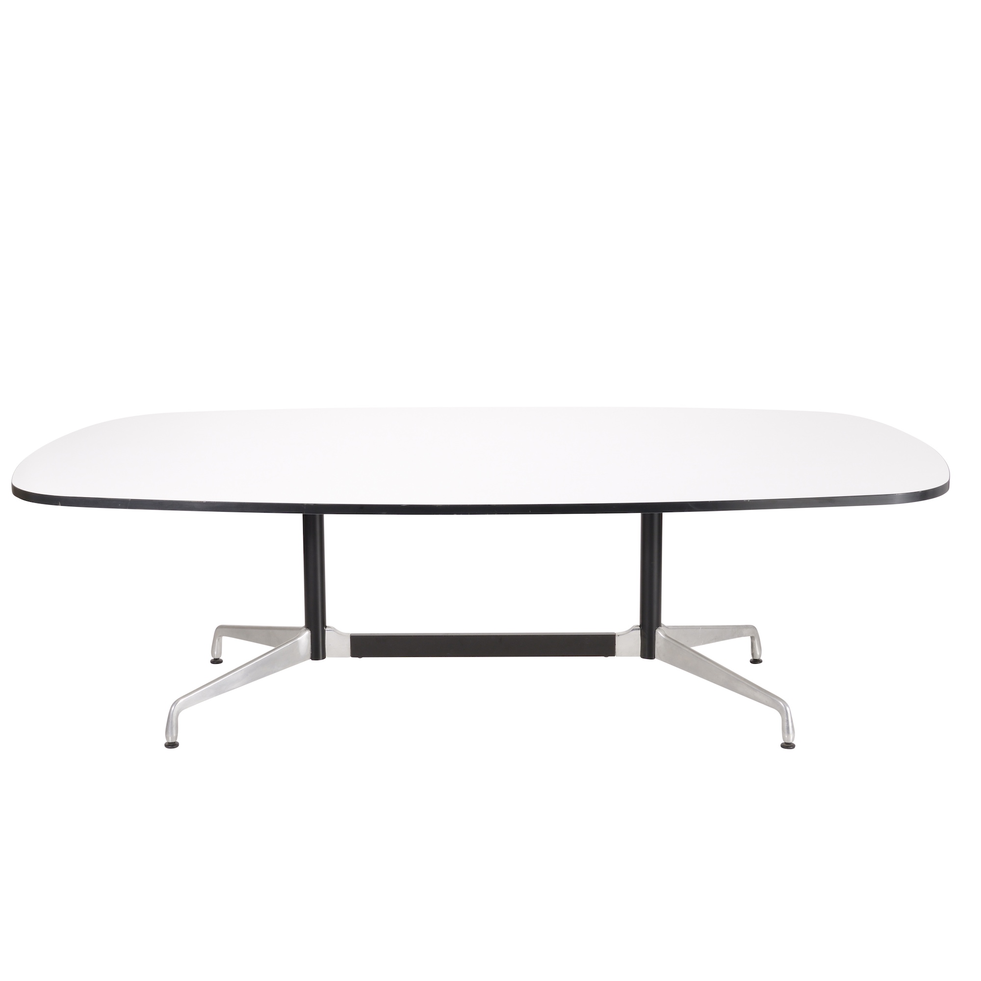 Aluminium segmented base with rectangular rounded edge laminate top in white with black edge.