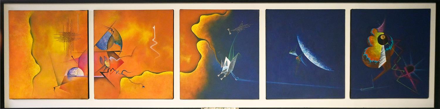 OIL ON CANVAS, 5 PANELS, ARTIST'S NAME ON FRAME PLAQUE, 45 X 40.5CM (EACH PANEL), FRAME: 56 X 225CM