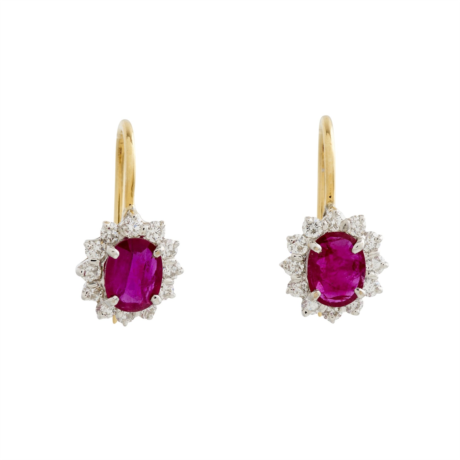 A PAIR OF BURMESE RUBY AND DIAMOND EARRINGS IN 18CT GOLD, TO SHEPHERD HOOK FITTINGS, THE RUBIES TOTALLING 2.39CTS, WITH DIAMONDS TOTALLING 0.88CTS, 21MM, 4.7GMS, ACCOMPANIED BY A GEM REPORT