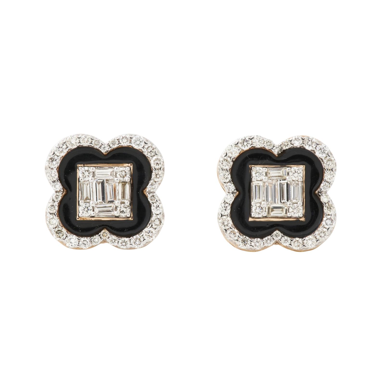 A PAIR OF DIAMOND AND BLACK ENAMEL EARRINGS IN 18CT ROSE GOLD, THE DIAMONDS TOTALLING APPROXIMATELY 1.50CTS, 15MM, 5.8GMS