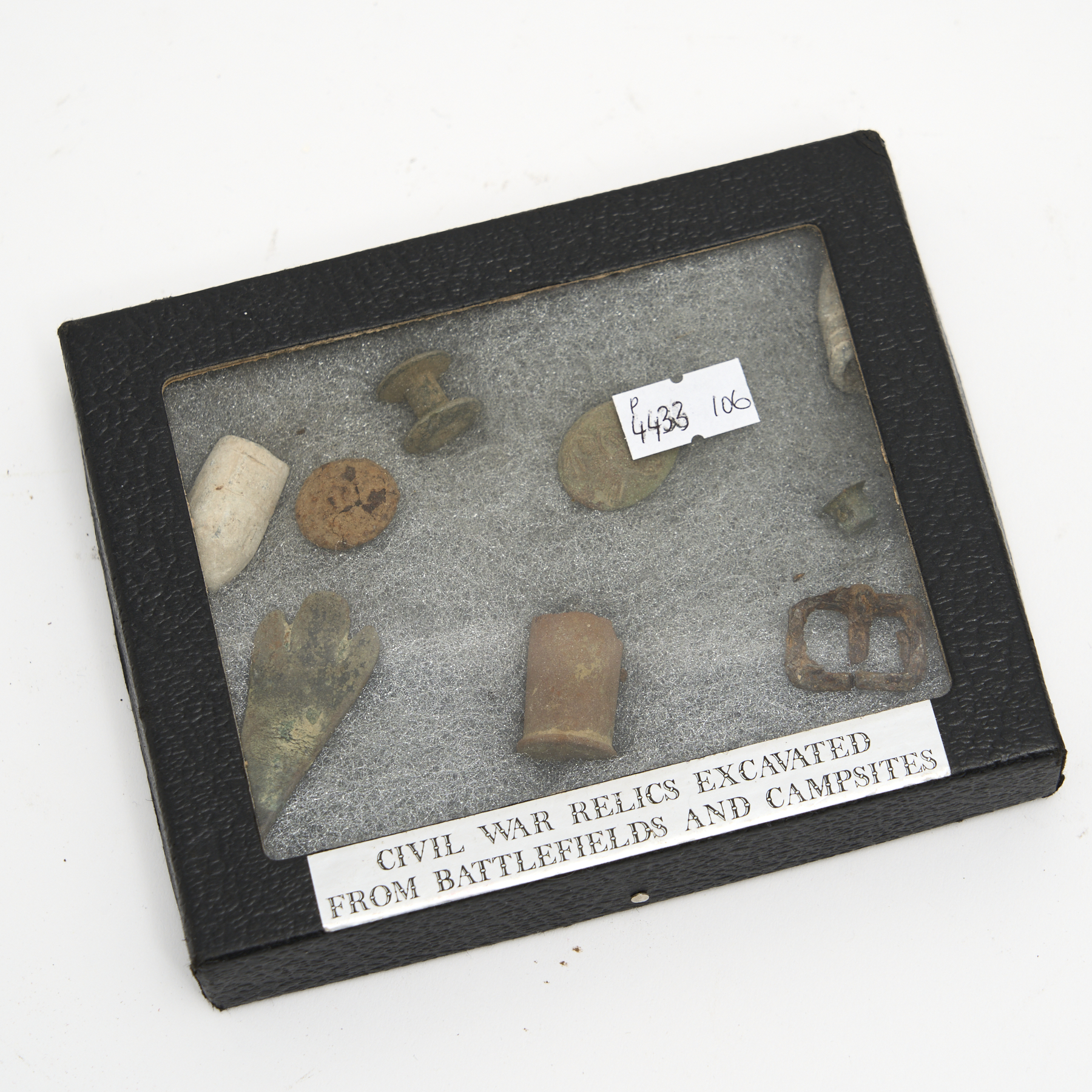 A BOXED COLLECTION OF CIVIL WAR RELICS EXCAVATED FROM BATTLEFIELDS AND CAMPSITES W.14CM