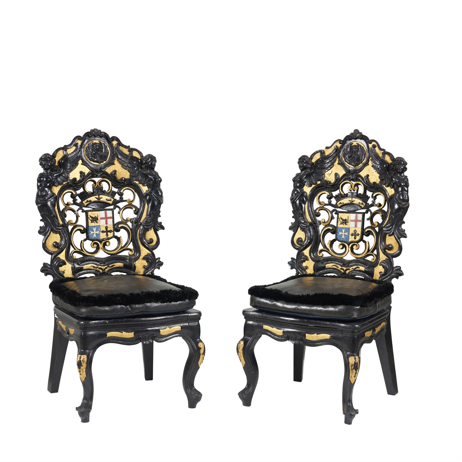 Each with a shaped back elaborately carved and pierced with winged figures as supports flanking a winged lion of St Mark above the heraldic escutcheon and crest of the Regia Marina, the seat of a loose leather-covered cushion raised on cabriole supports to the front, ebonised and gilt with painted escutcheons (the decoration refreshed)