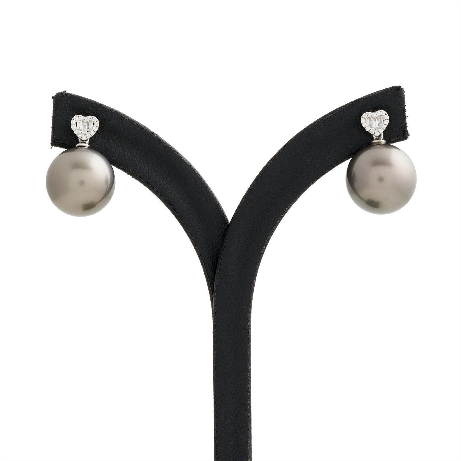 A PAIR OF TAHITIAN PEARL AND DIAMOND EARRINGS IN 18CT WHITE GOLD, THE PEARLS MEASURING APPROXIMATELY 14.3MM, THE DIAMONDS TOTALLING 0.16CTS, TO POST AND BUTTERFLY FITTINGS