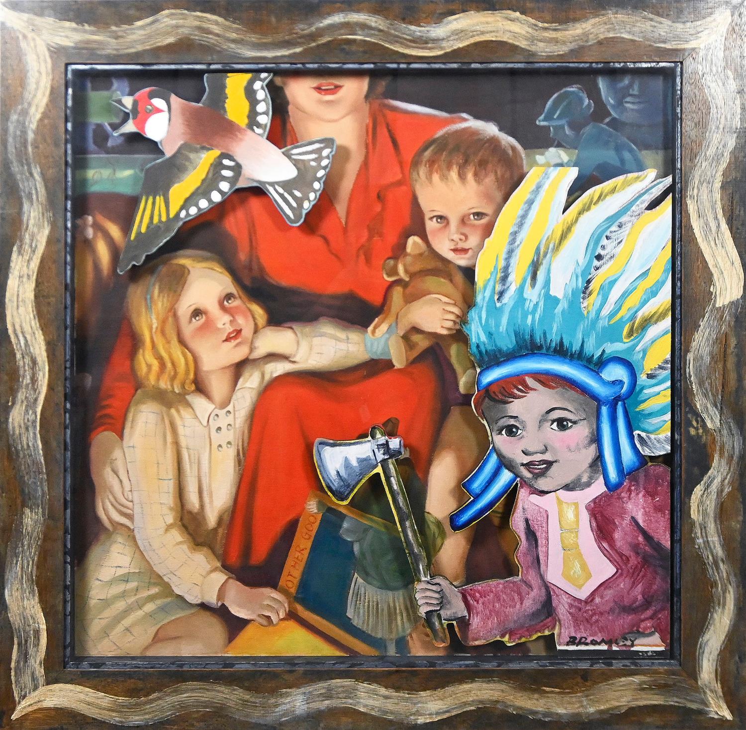 COLLAGE WITH OIL PAINT, WOOD AND BOARD IN AN ORIGINAL BOX FRAME, SIGNED LOWER RIGHT, BOX FRAME SIZE: 94 X 93 X 5.5CM