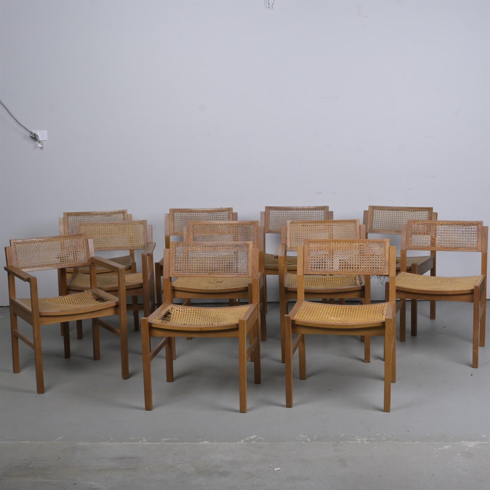 A SET OF ELEVEN WOODEN AND RATTAN DINING CHAIRS (A/F) (76CM H X 57CM W X 50CM D)