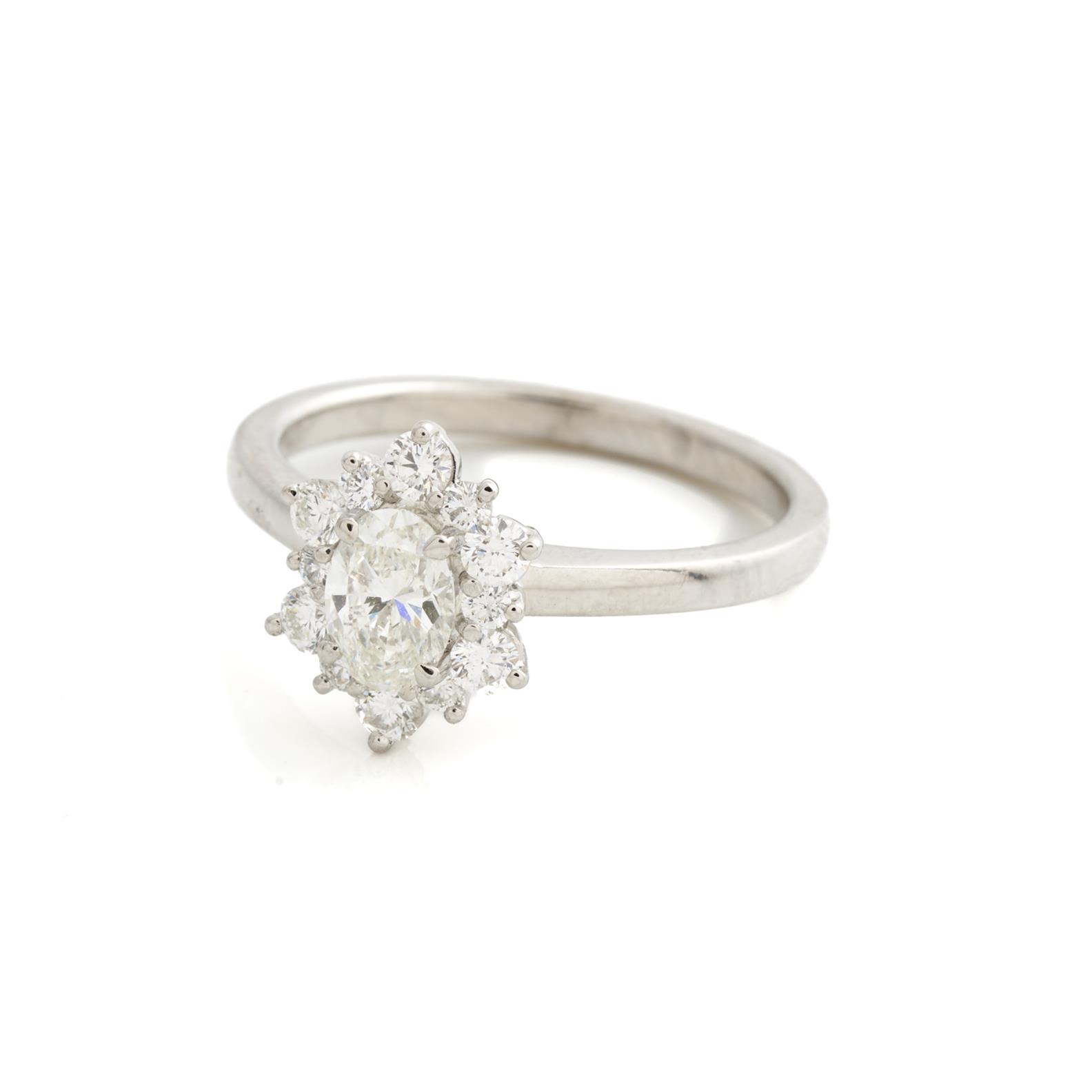 A DIAMOND CLUSTER RING IN 18CT WHITE GOLD, THE CENTRAL OVAL CUT DIAMOND WEIGHING 0.50CTS (G, VS2), WITH THE OTHER DIAMONDS TOTALLING APPROXIMATELY 0.524CTS, SIZE M 1/2, ACCOMPANIED BY A GIA CERTIFICATE FOR THE CENTRAL DIAMOND