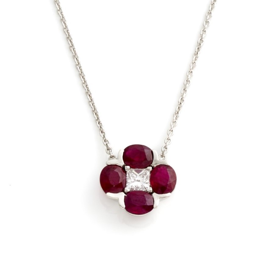 A RUBY AND DIAMOND PENDANT NECKLACE IN PLATINUM, THE DIAMOND WEIGHING 0.26CTS, WITH RUBIES TOTALLING 1.65CTS, PENDANT MEASURING 11MM, CHAIN LENGTH 460MM, 5.3GMS