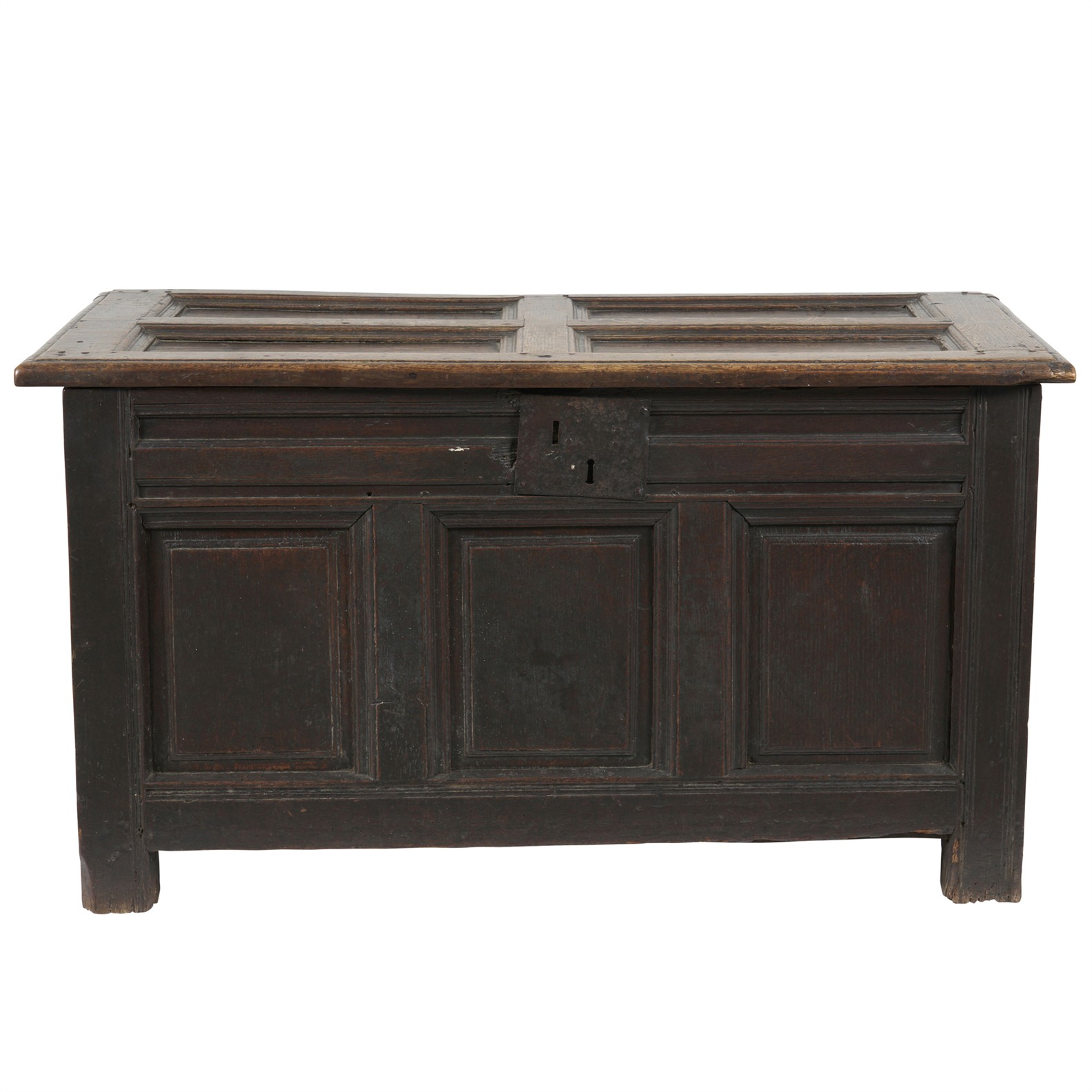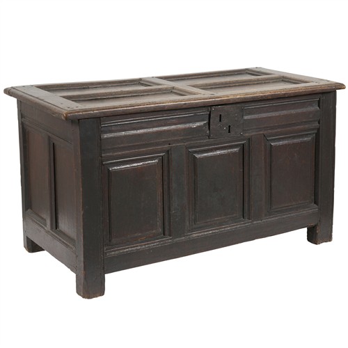 Of conventional 'coffer' form, the hinged cover enclosing an open interior, the top and all sides moulded and panelled