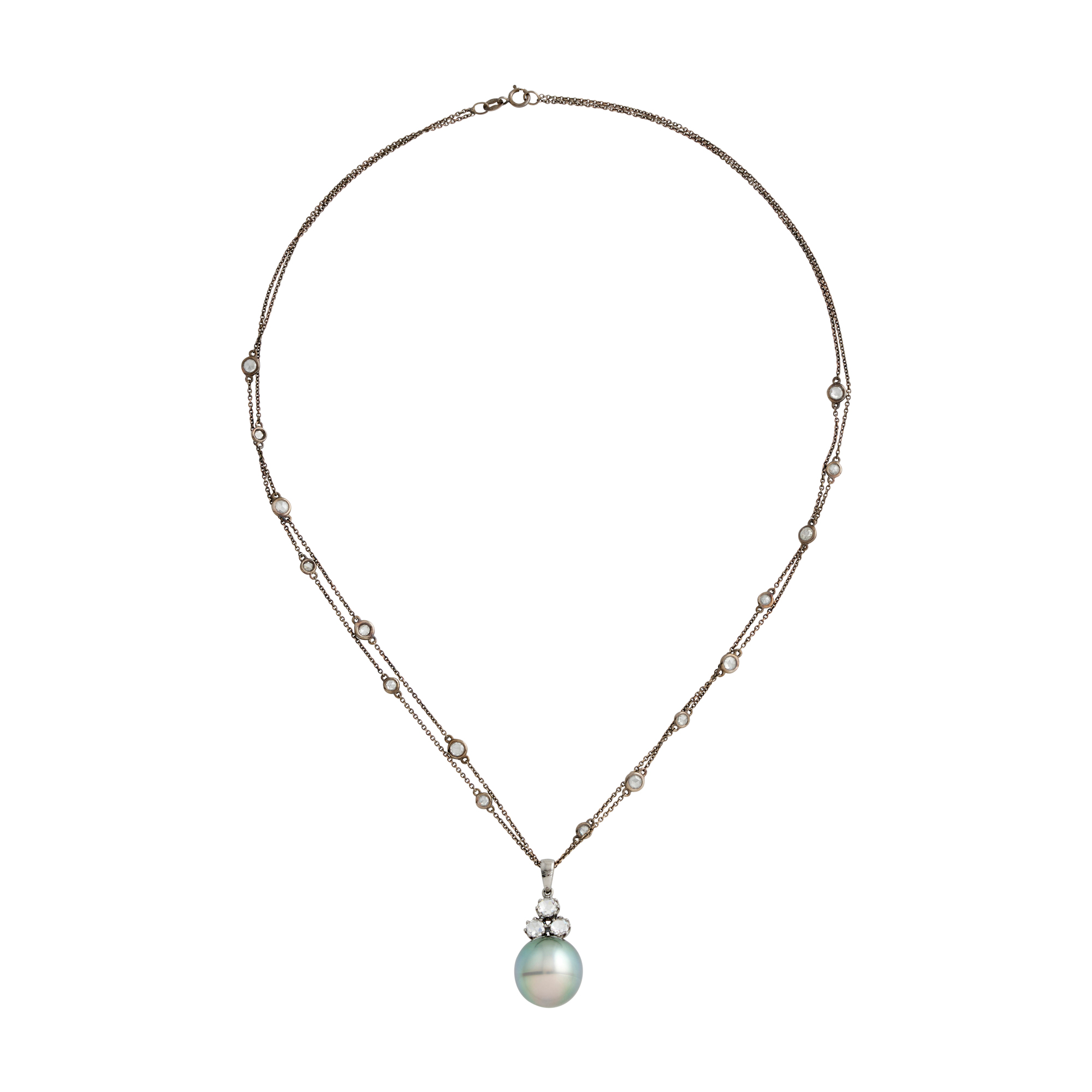18CT BLACKENED GOLD, TAHITIAN PEARL AND DIAMOND PENDANT NECKLACE