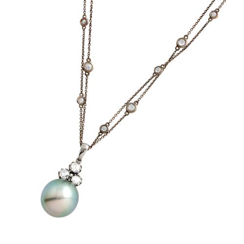 Comprising of a near round pearl of mid grey hues measuring 14.3mm below a claw-set rose-cut diamond trefoil surmount, suspended from a double fine trace chain set at intervals with collet-set single-cut diamonds, the diamonds together weighing approximately 0.60 carats, completed by a bolt ring clasp, pendant length 32, necklace length 440mm, gross weight approximately 11.1 grams.