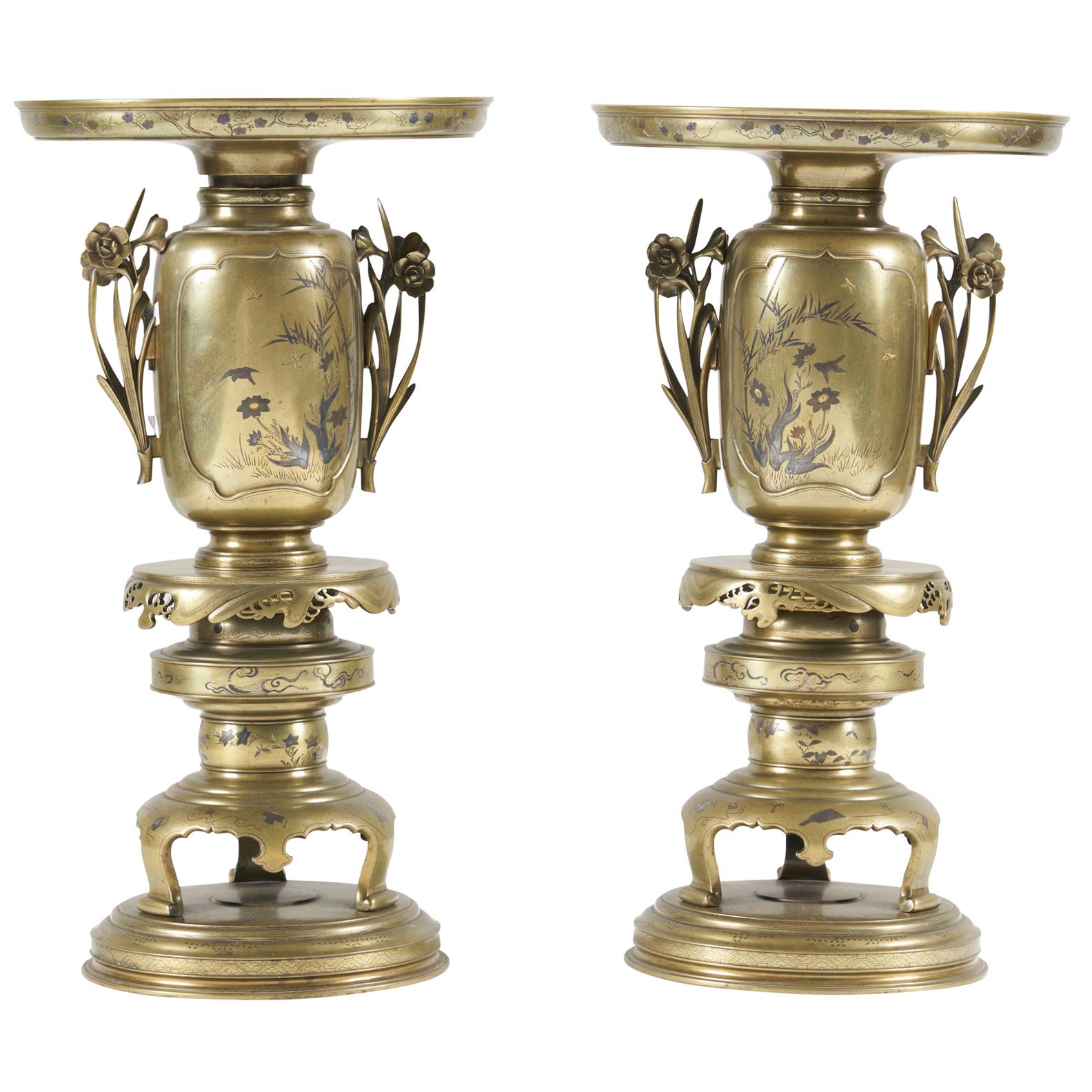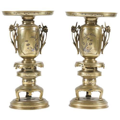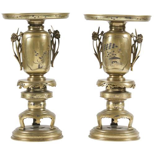 A pair of large and impressive gilt bronze usubata (flower vases for ikebana), of classic form, each in three segments, the bases inlaid in silver and decorated with Japanese festival elements, the mid-sections with designs of scrolling clouds and crashing waves and the main sections decorated in inlaid silver and gold of floral scenes, the handles realistically cast as irises in bloom with repeating iris design to the top trays and flat inlay to the sides of the dishes, unsigned