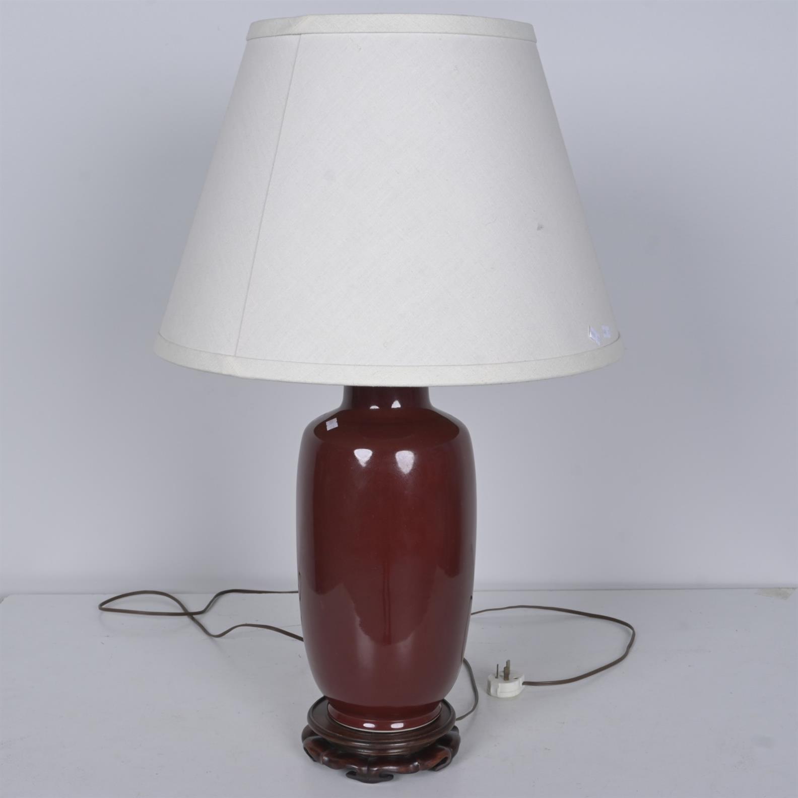 A CHINESE OXBLOOD GLAZED VASE CONVERTED TO A TABLE LAMP (A/F) (81H X 49DIA CM)