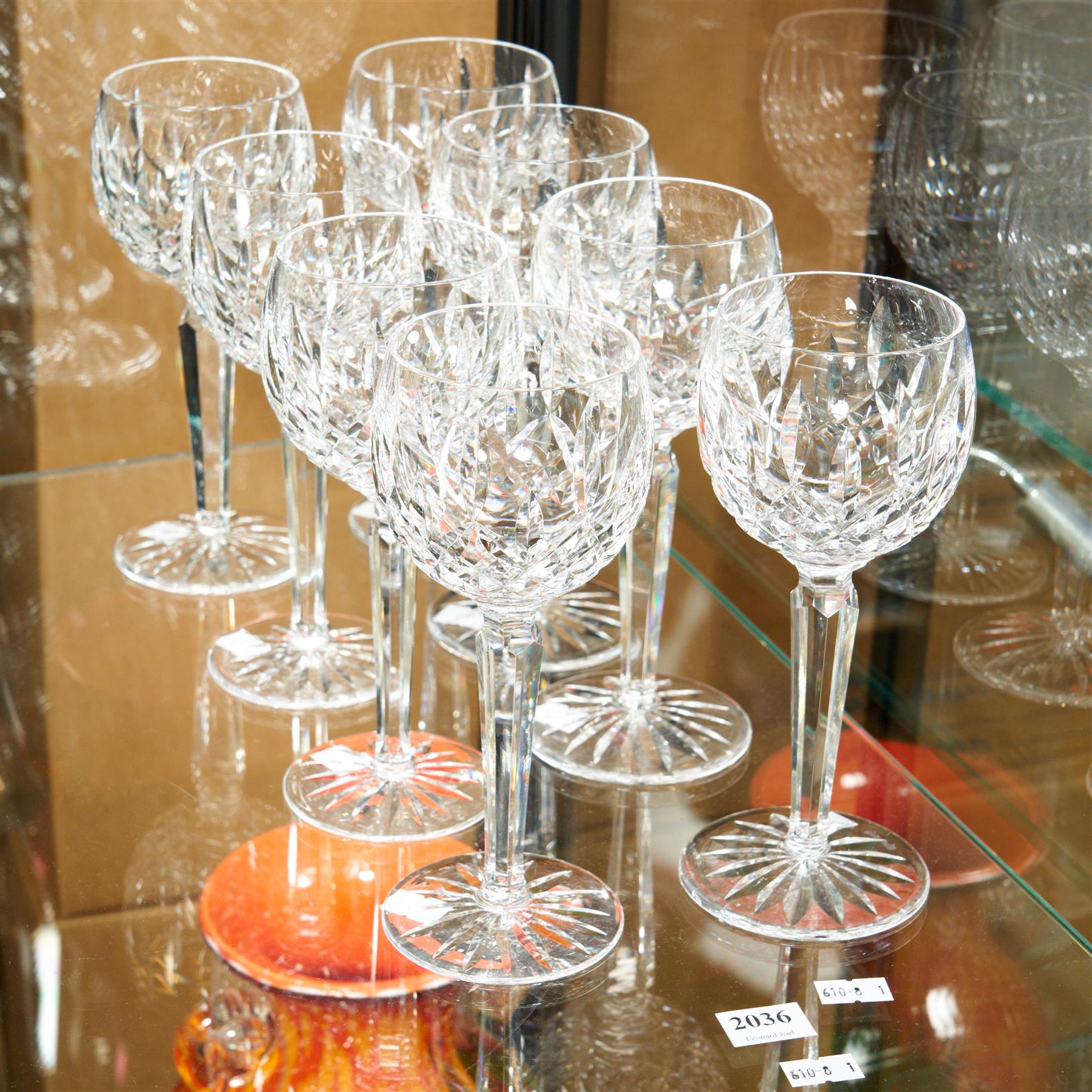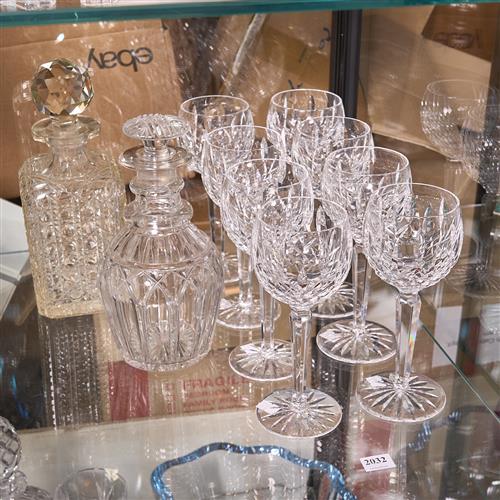 A SET OF EIGHT WATERFORD CRYSTAL LISMORE PATTERN HOCK STEM BALLOON WINE GLASSES TOGETHER WITH TWO DECANTERS, ONE A VICTORIAN CUT CRYSTAL H.19CM