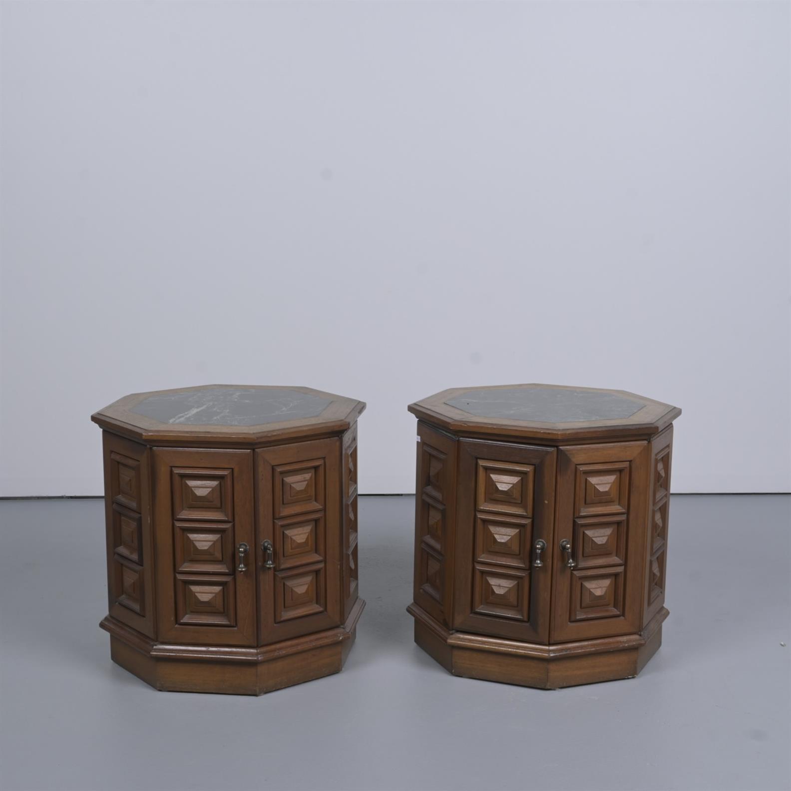 A PAIR OF MARBLE-TOPPED SIDE CABINETS (56H X 61DIA CM) (THIS ITEM MUST BE REMOVED BY CARRIERS AT THE CUSTOMER'S EXPENSE. LEONARD JOEL STAFF CANNOT ASSIST CARRYING THIS ITEM)