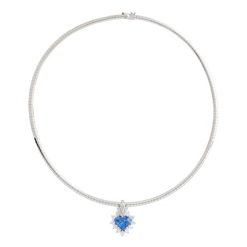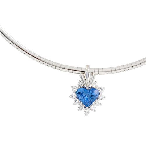 Featuring a pendant of cluster design, centring a claw-set heart-cut sapphire weighing approximately 2.20 carats within a surround of claw-set brilliant-cut diamonds to a tapered baguette-cut diamond surmount, the diamonds together weighing approximately 0.70 carats, suspended from a omega collar completed by a box clasp, pendant length 22mm, width 15mm, collar length 410mm, gross weight approximately 25.5 grams