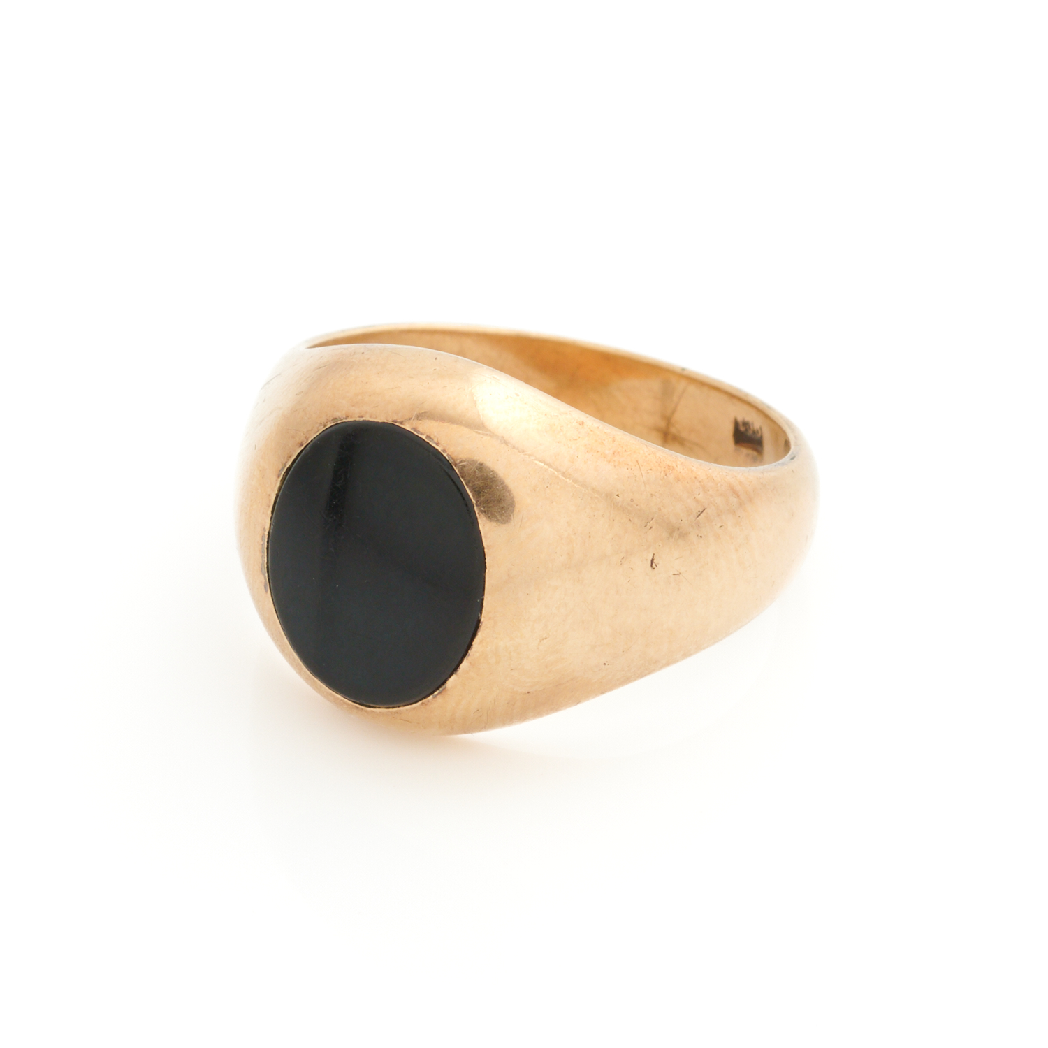 AN ONYX SIGNET RING IN 9CT GOLD, SIZE S, 7.1GMS
