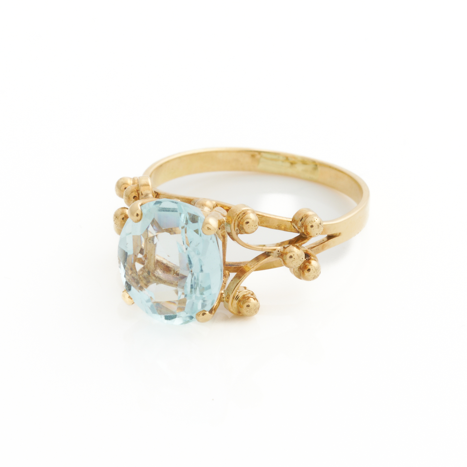 A GEM SET RING IN 9CT GOLD, SIZE O, 3.7GMS
