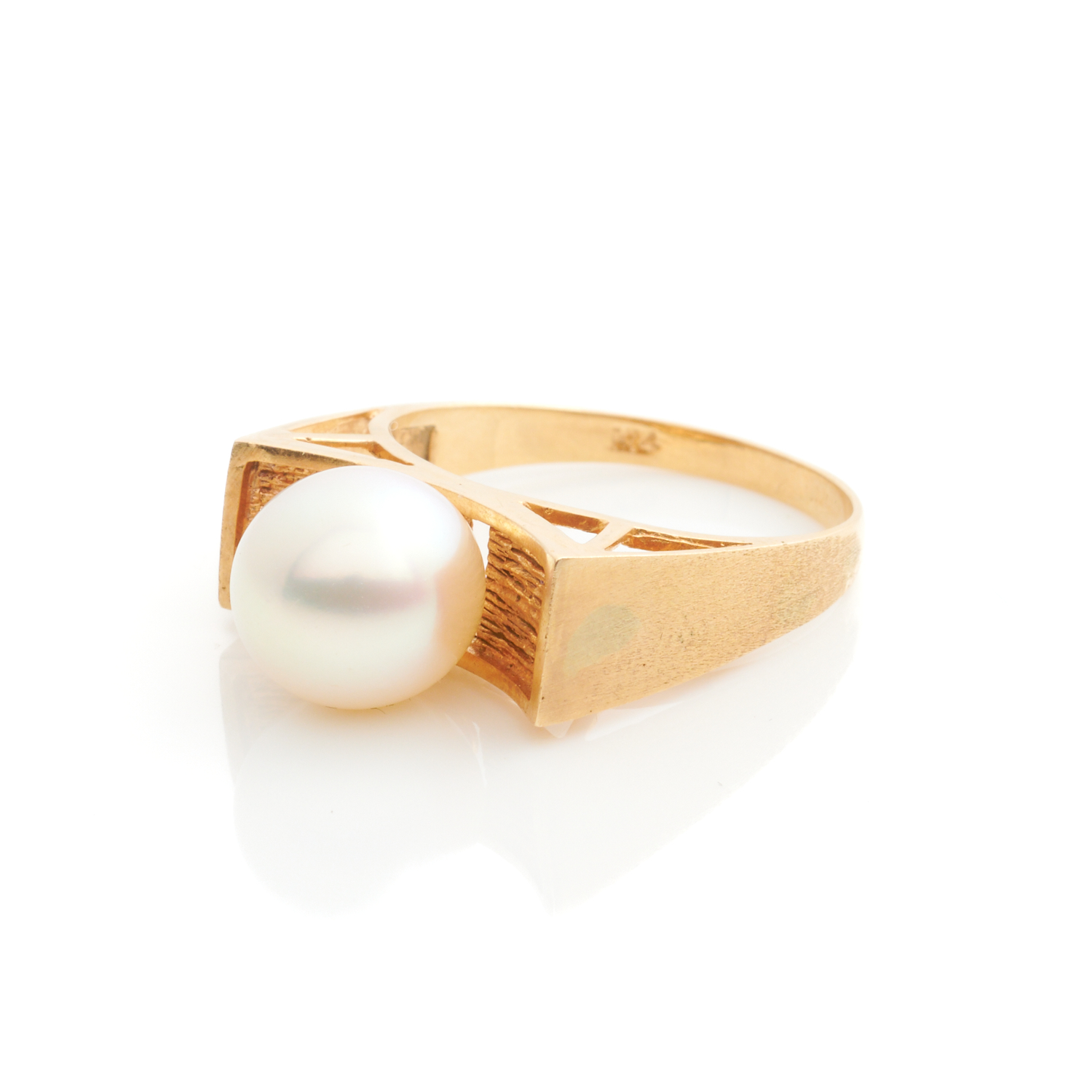 A PEARL RING IN 14CT TEXTURED GOLD, THE PEARL MEASURING 8.6MM, SIZE N, 3.7GMS