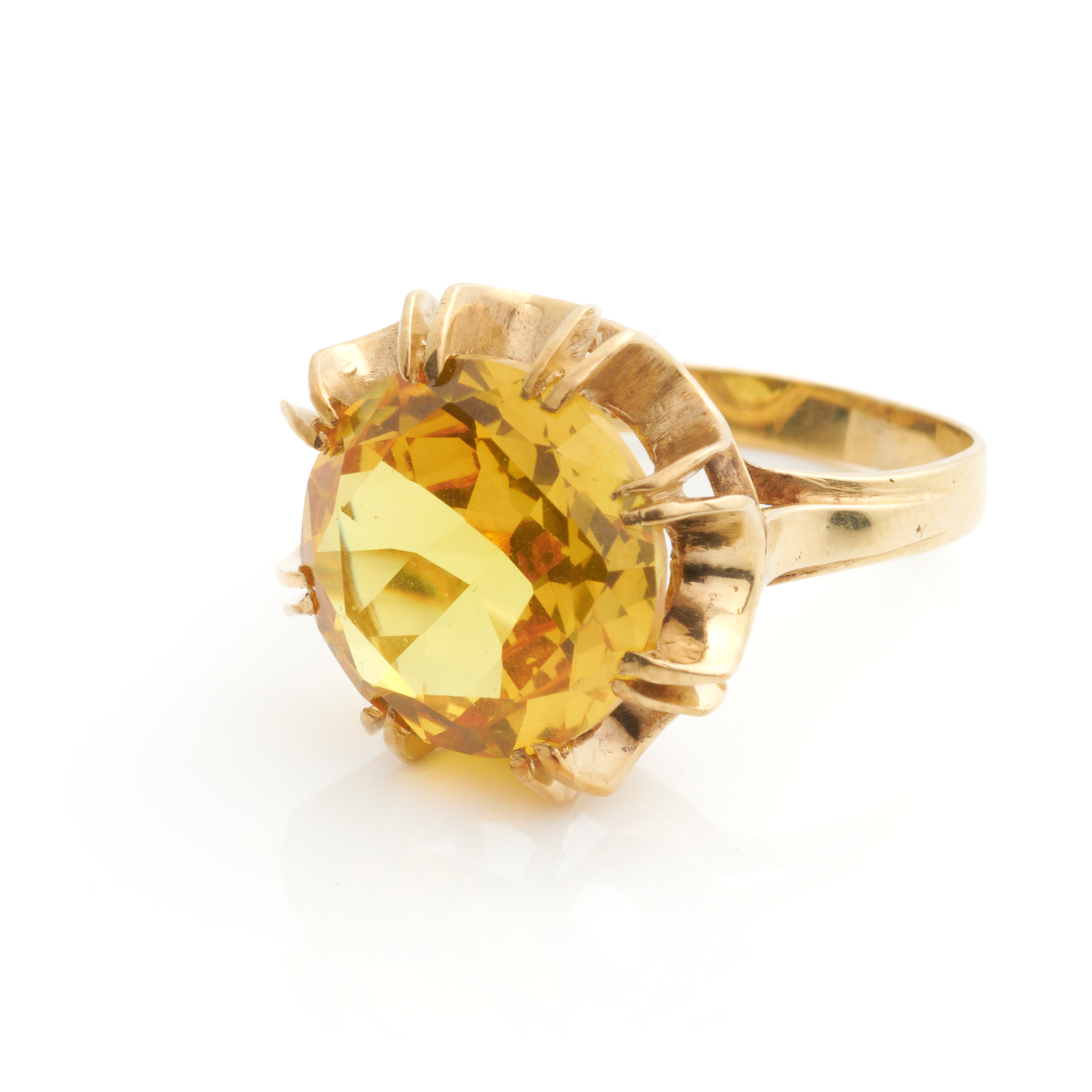 A LARGE YELLOW PASTE RING IN 14CT GOLD, THE GEM MEASURING 13.2MM, SIZE R 1/2, 6.4GMS