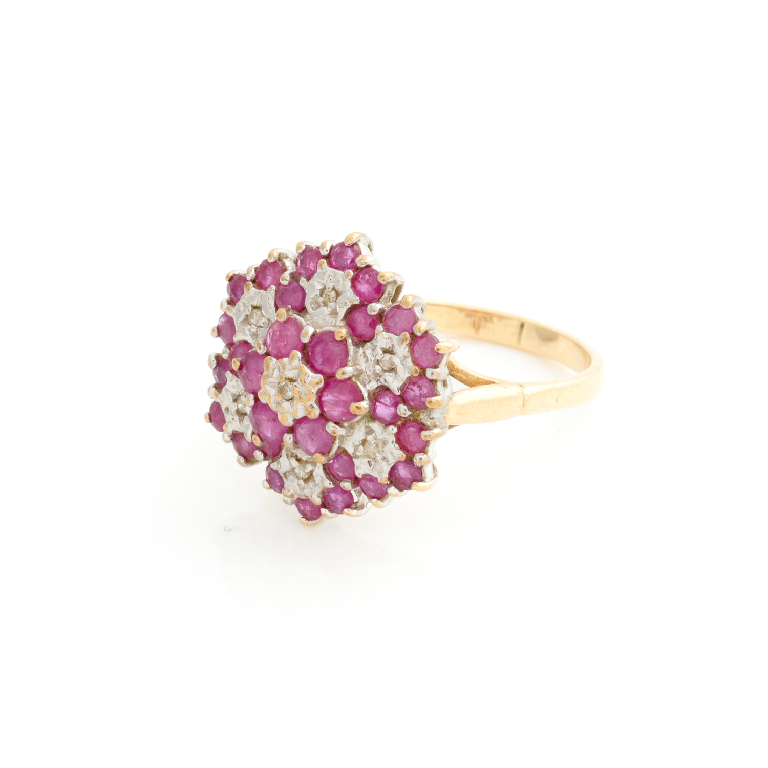 A RUBY AND DIAMOND CLUSTER RING IN 9CT GOLD, SIZE M, 3.7GMS