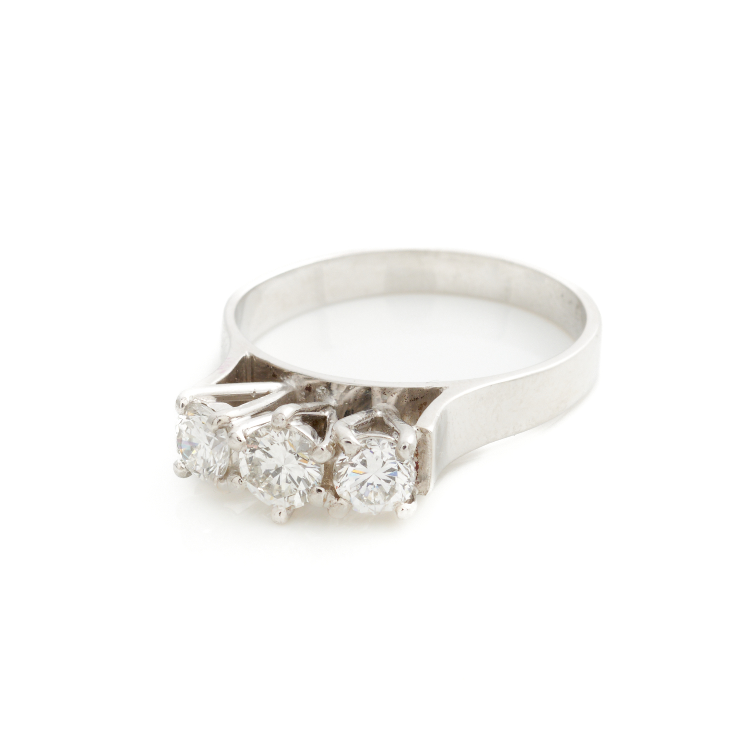 A THREE STONE DIAMOND RING IN 18CT WHITE GOLD, THE DIAMONDS TOGETHER WEIGHING APPROXIMATELY 0.75CTS, (H-I, SI1-P1), SIZE S, 5.2GMS