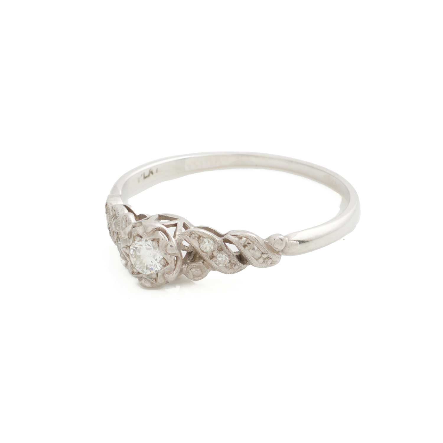 A DIAMOND RING IN 18CT WHITE GOLD AND PLATINUM, THE CENTRAL DIAMOND WEIGHING APPROXIMATELY 0.10CTS, SIZE R 1/2, 1.9GMS