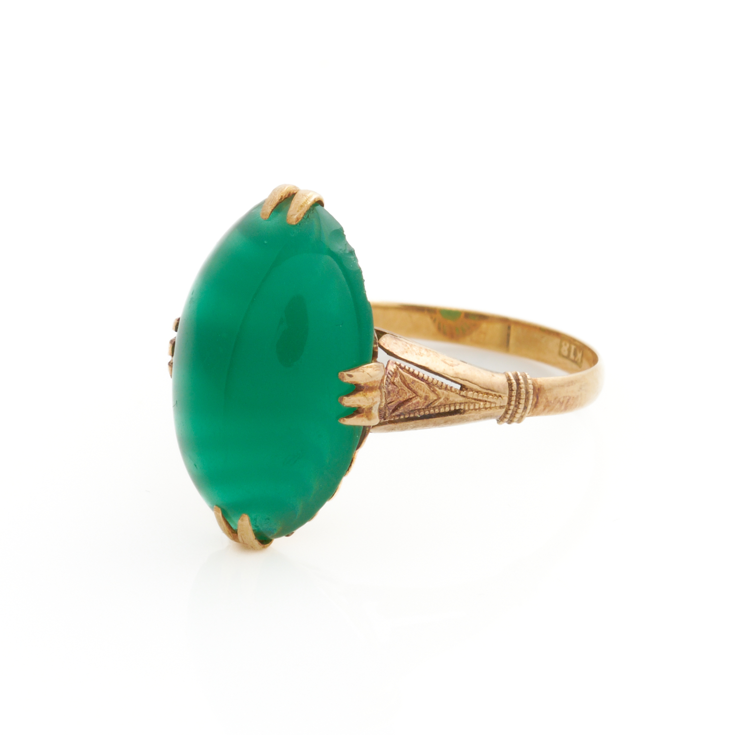 A CHRYSOPRASE RING IN 18CT GOLD, THE CHRYSOPRASE MEASURING APPROXIMATELY 15 X 10MM, SIZE M 1/2, 2.2GMS