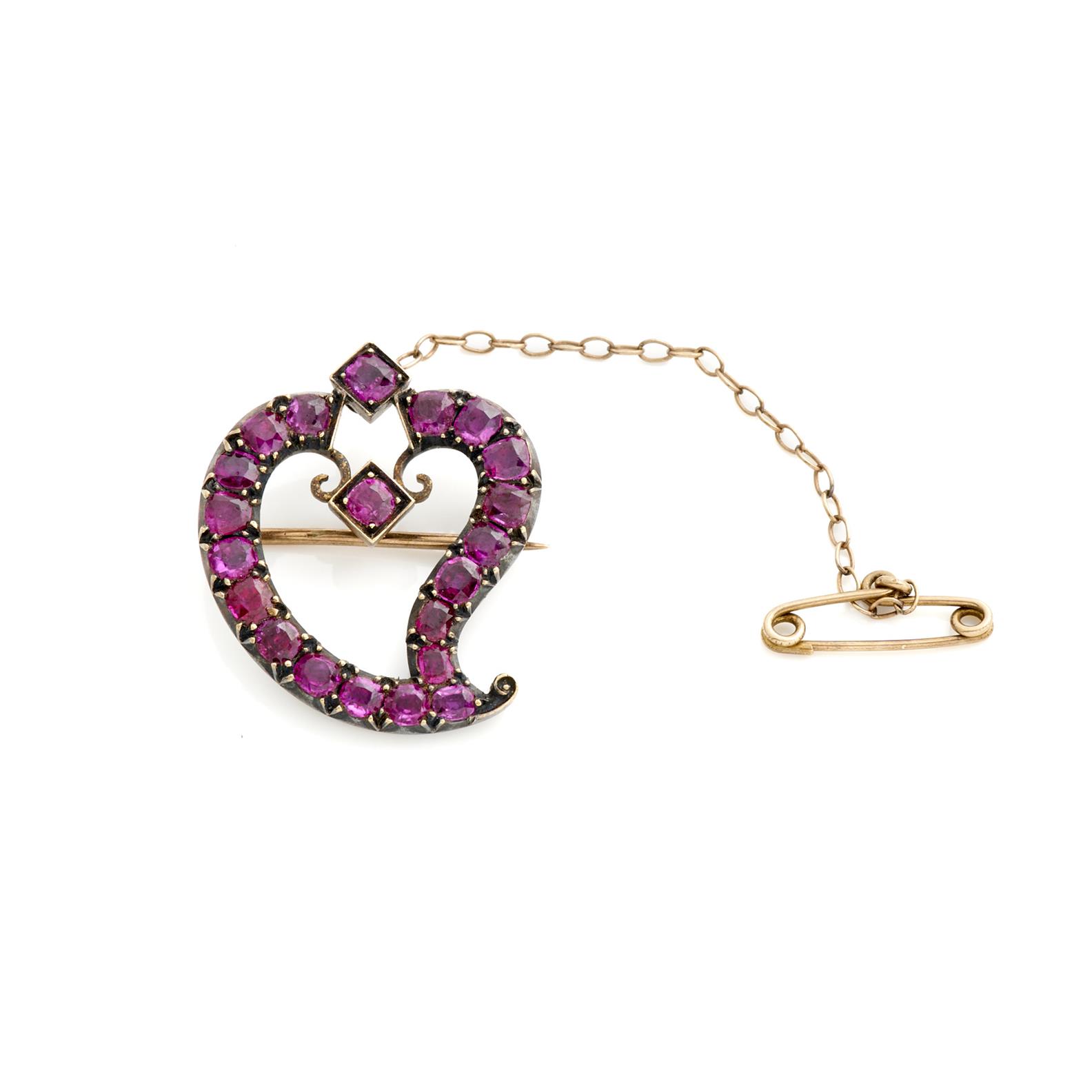 A REGENCY PERIOD RUBY 'WITCHES HEART' BROOCH IN 15CT GOLD AND SILVER, CONSISTING OF NINETEEN TABLE CUT RUBIES, EACH MEASURING APPROXIMATELY 3 X 3MM, SAFETY CHAIN IN 9CT GOLD, 28 X 24MM, 7.8GMS, CIRCA 1830