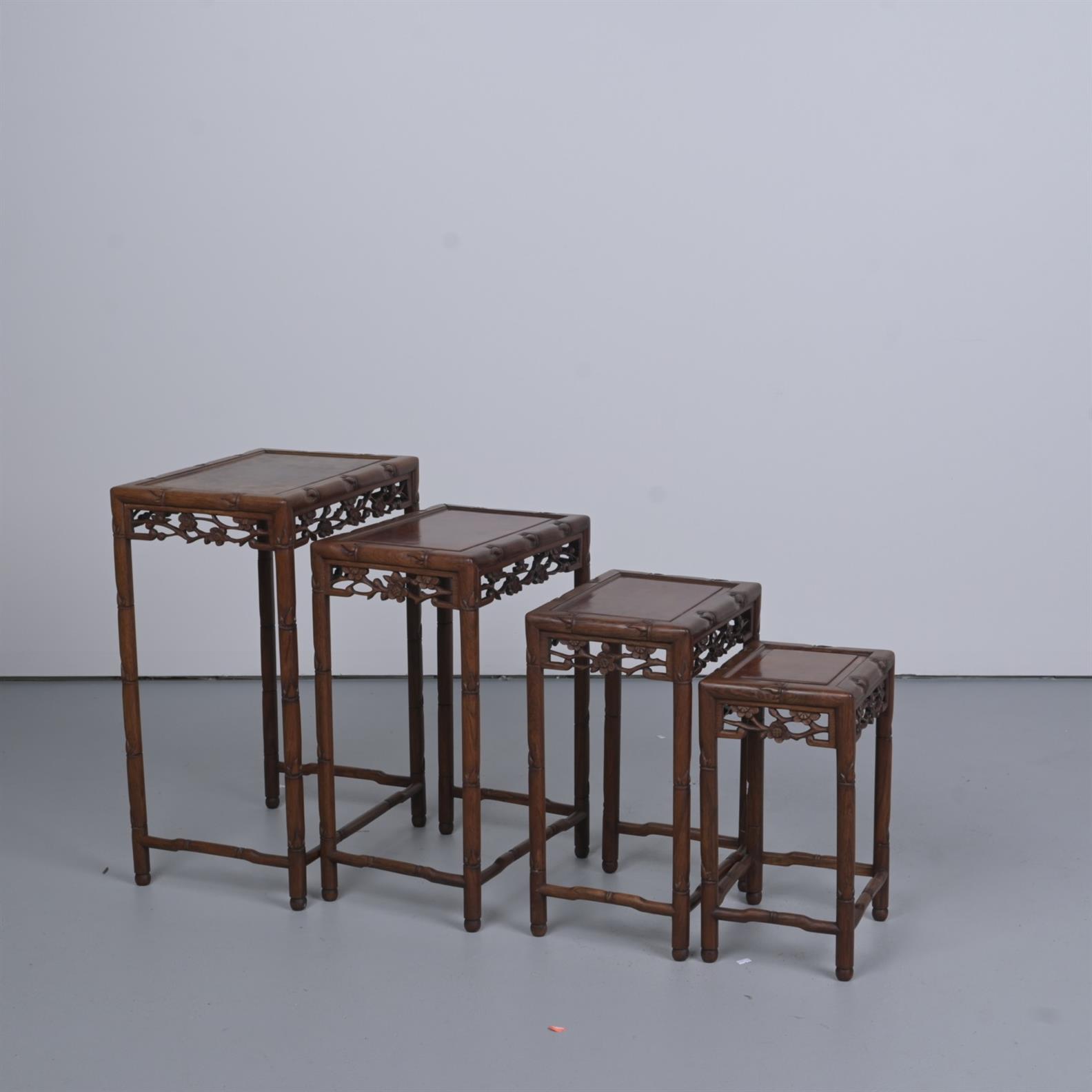 A SET OF FOUR CARVED CHINESE ELM NESTING TABLES (67H X 46W X 32D CM)